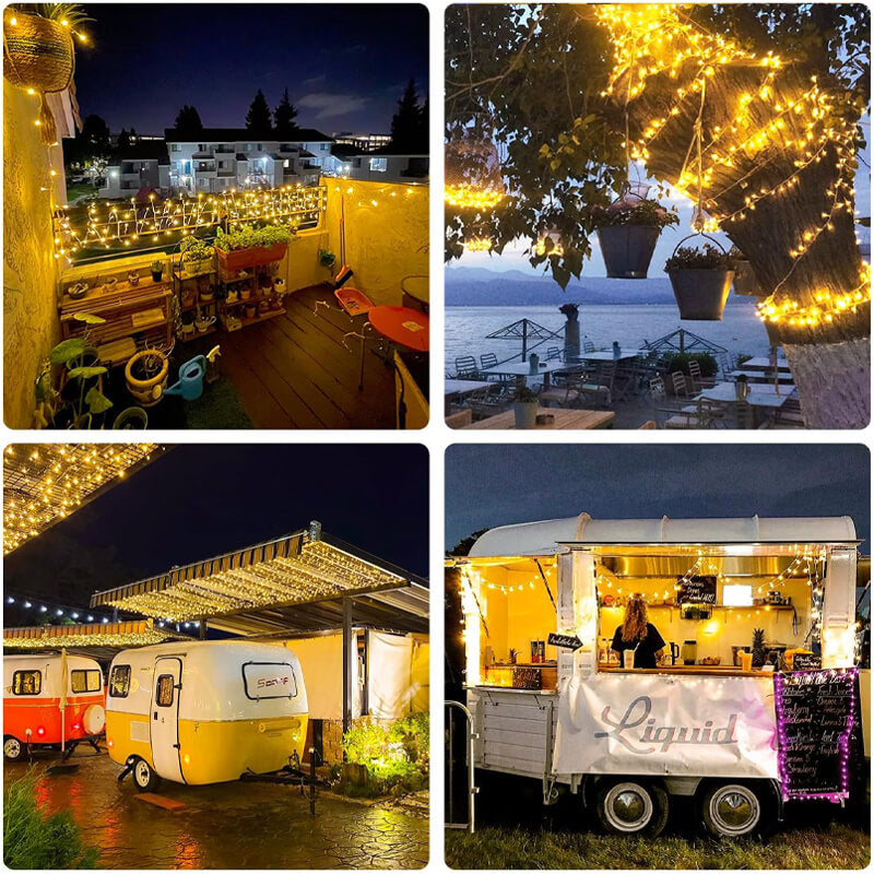 The solar rope decorative lights can be used for many scenes indoor and outdoor. Charming and romantic decorative lights can be wrapped around trees, gazebos, trampolines, fences, or decorated on trails, patios, gardens, decks, wreaths, bushes, camping, RVs, tents, swings, balcony lights and more.