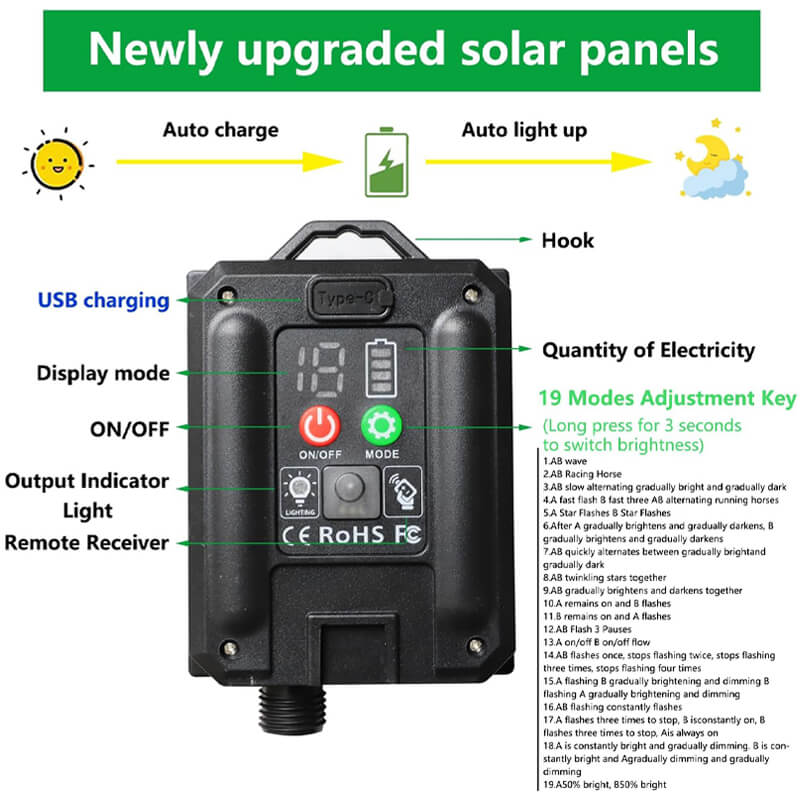 2 control method: the mode button of the solar panel and the remote control. The solar panel is easy to install, no need for outlets or complicated wiring, just simply install on the wall or insert on the lawn to place the solar panel. With a plastic rope reel, the light string is not easy to get tangled.