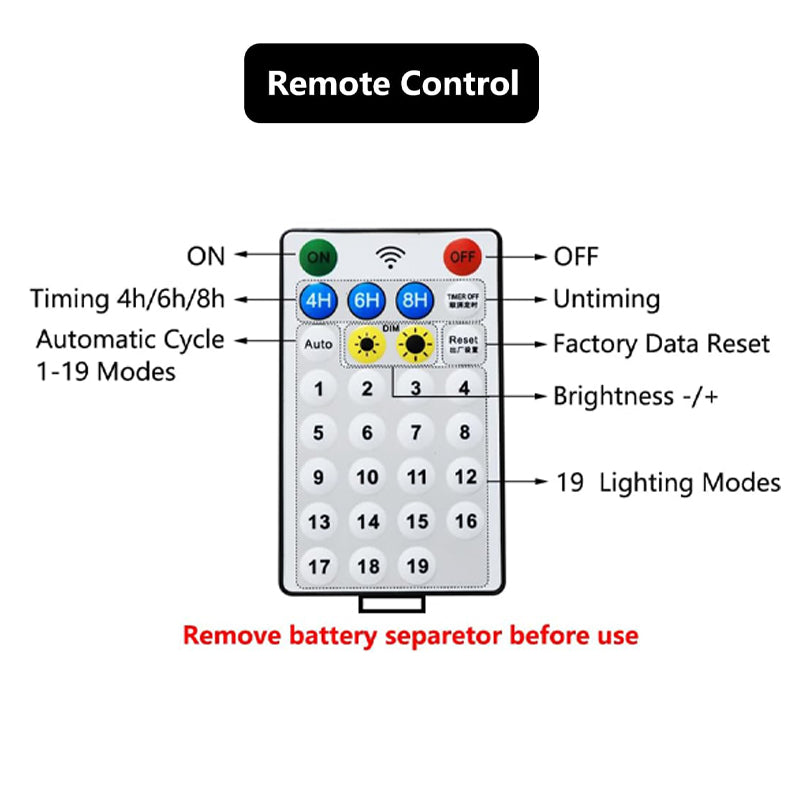 Upgraded and enlarged solar panels, increase the photoelectric conversion rate by 20% than others, a full charge can continuously light up for 2 nights lasts for 7-10 rainy days. Automatically turn on the lights when it gets dark every day, no need to turn them on manually, and can set 4/6/8 h timer setting.