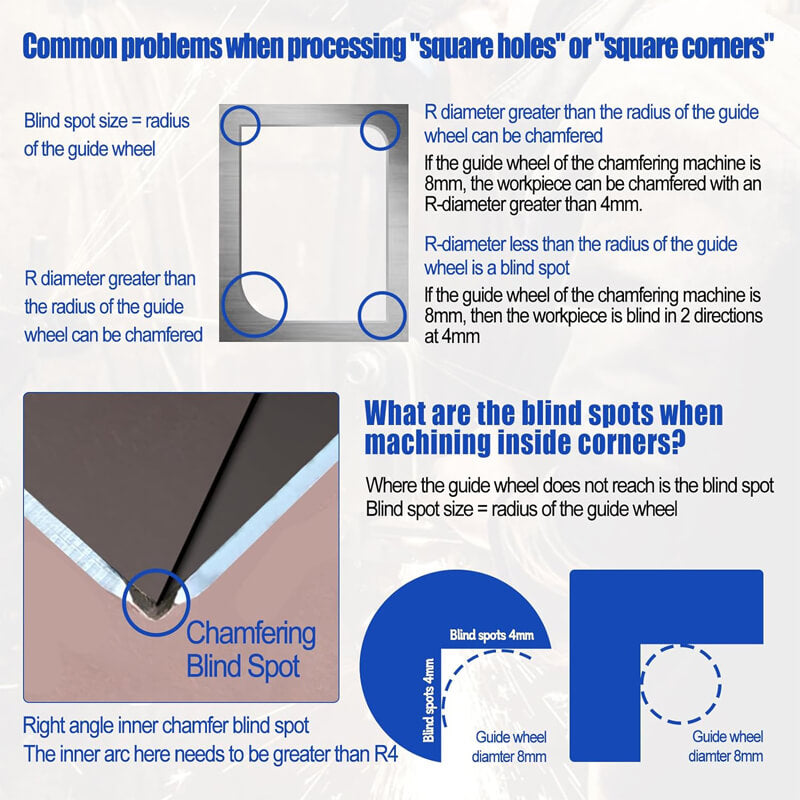 C blades for 0-1.5mm 45° angle chamfering and R blades for 1.5mm round-edge chamfering, versatile for chamfering various angles such as straight edge, inner/outer circle and polygon, U-shaped inner groove, ellipse circle, external bevel and other irregular shapes.