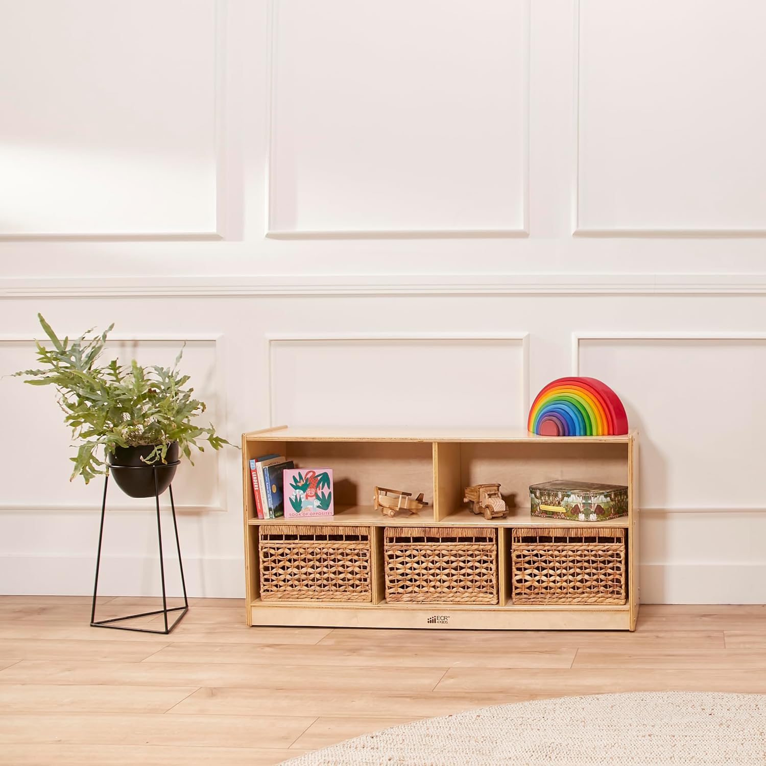 Durability and Safety: Crafted from sturdy wood, this cabinet ensures durability and safety in a classroom or playroom setting, providing a reliable storage solution that can withstand the daily use characteristic of Montessori-style learning.