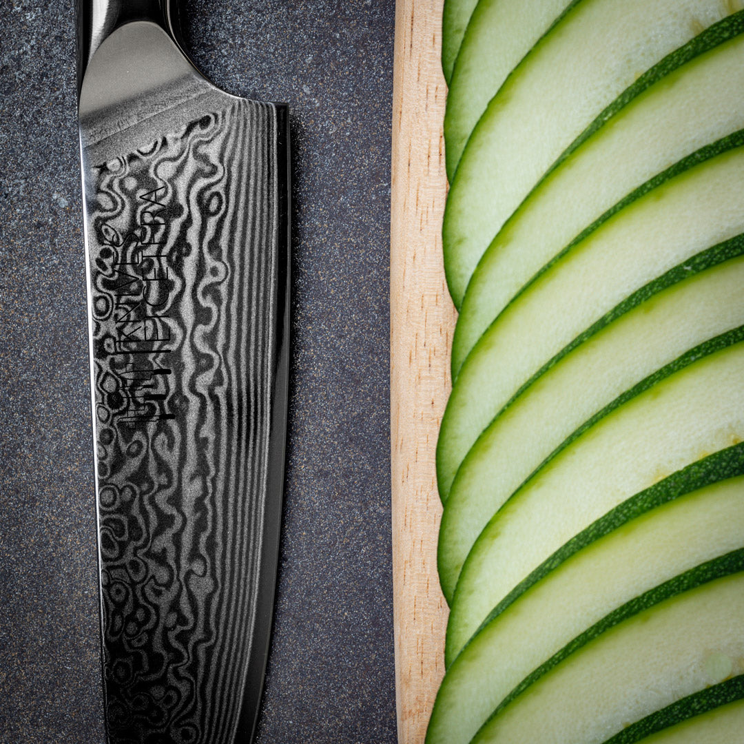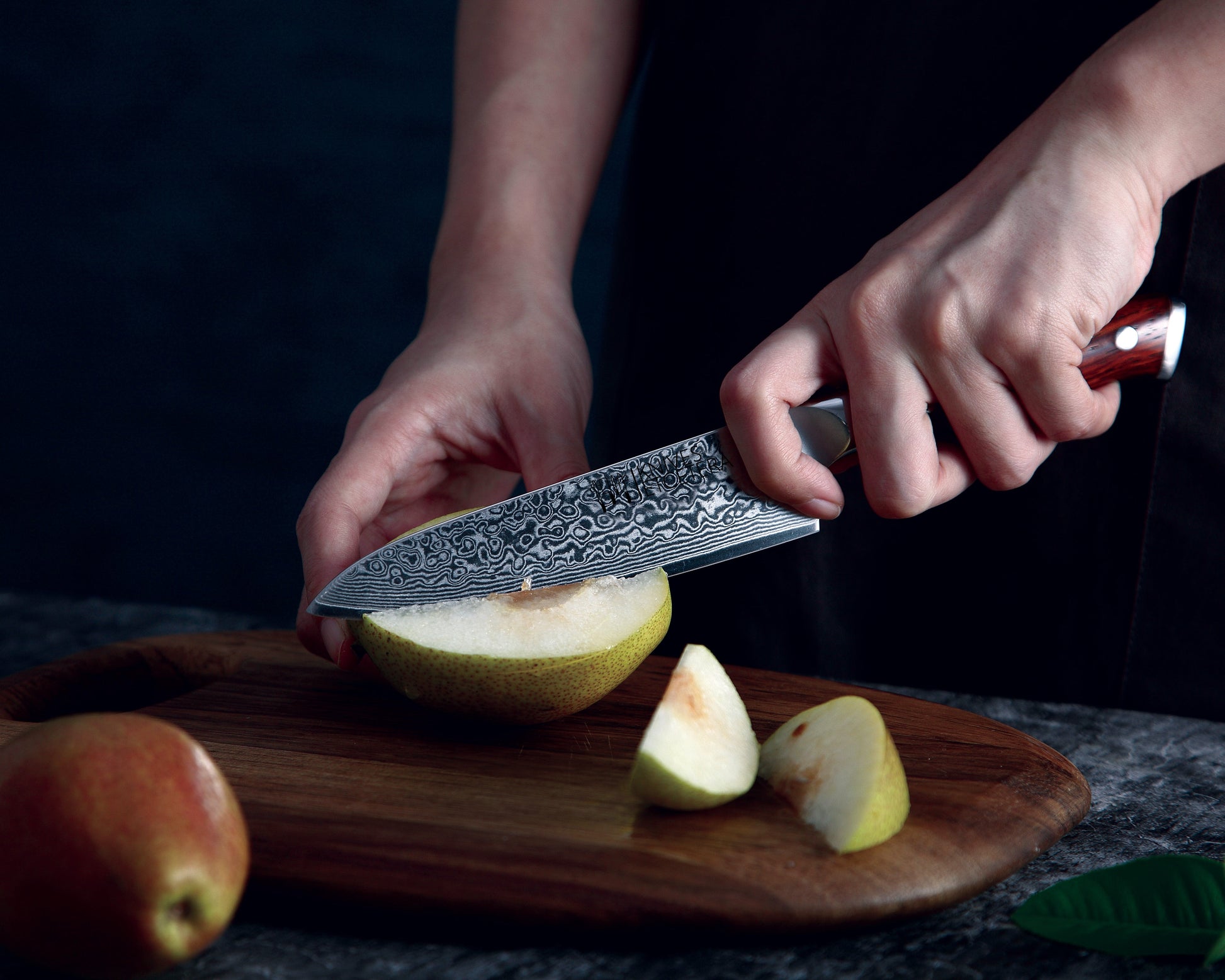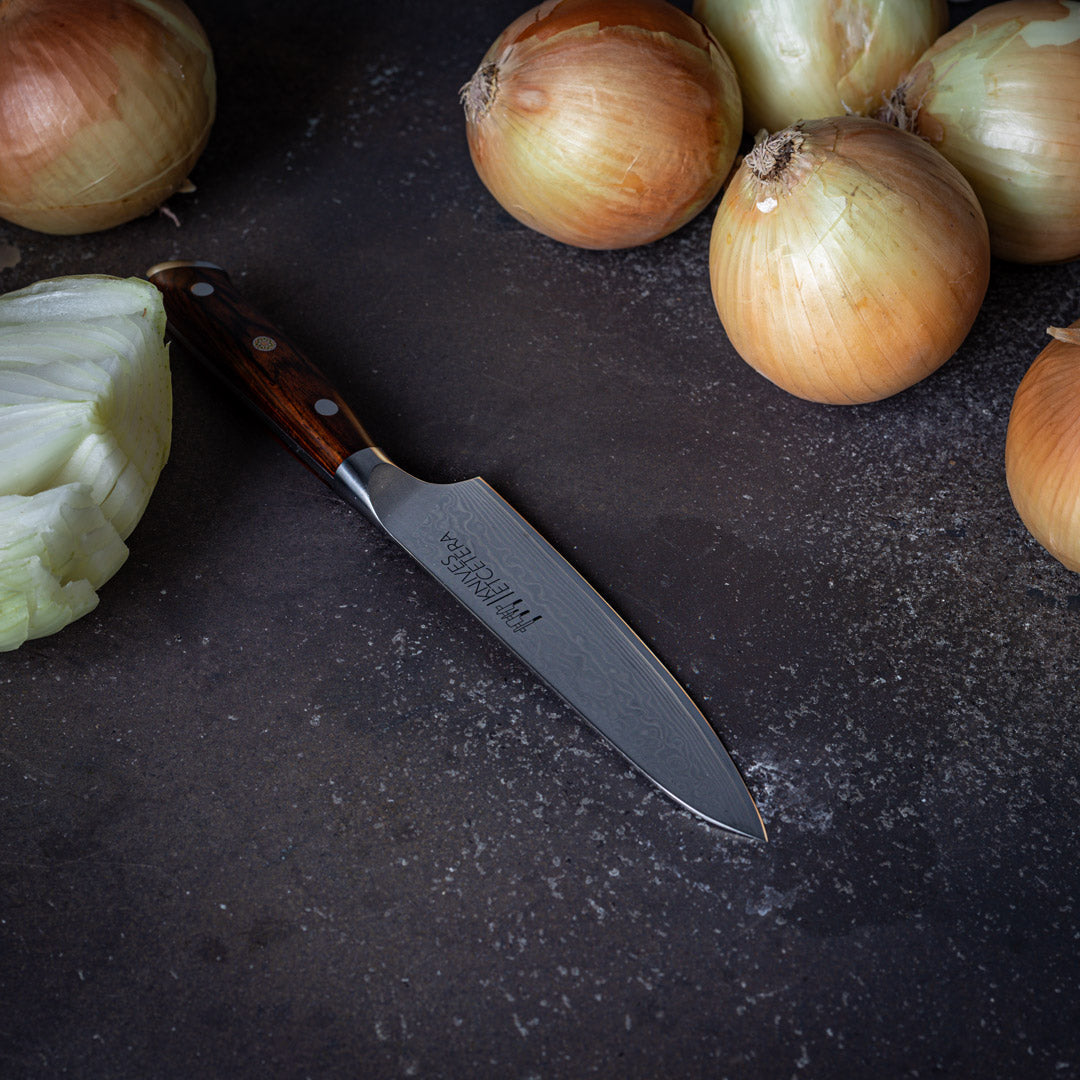 The Damascus Utility Knife is an all-purpose kitchen knife and is generally the entry-level blade for the beginning cooking enthusiast. It is lighter and smaller than the chef or santoku offering more control for the less experienced chef. This knife is a kitchen essential for peeling, slicing, and trimming fruits and vegetables. It can also be used to cut on small roasts and fowl.