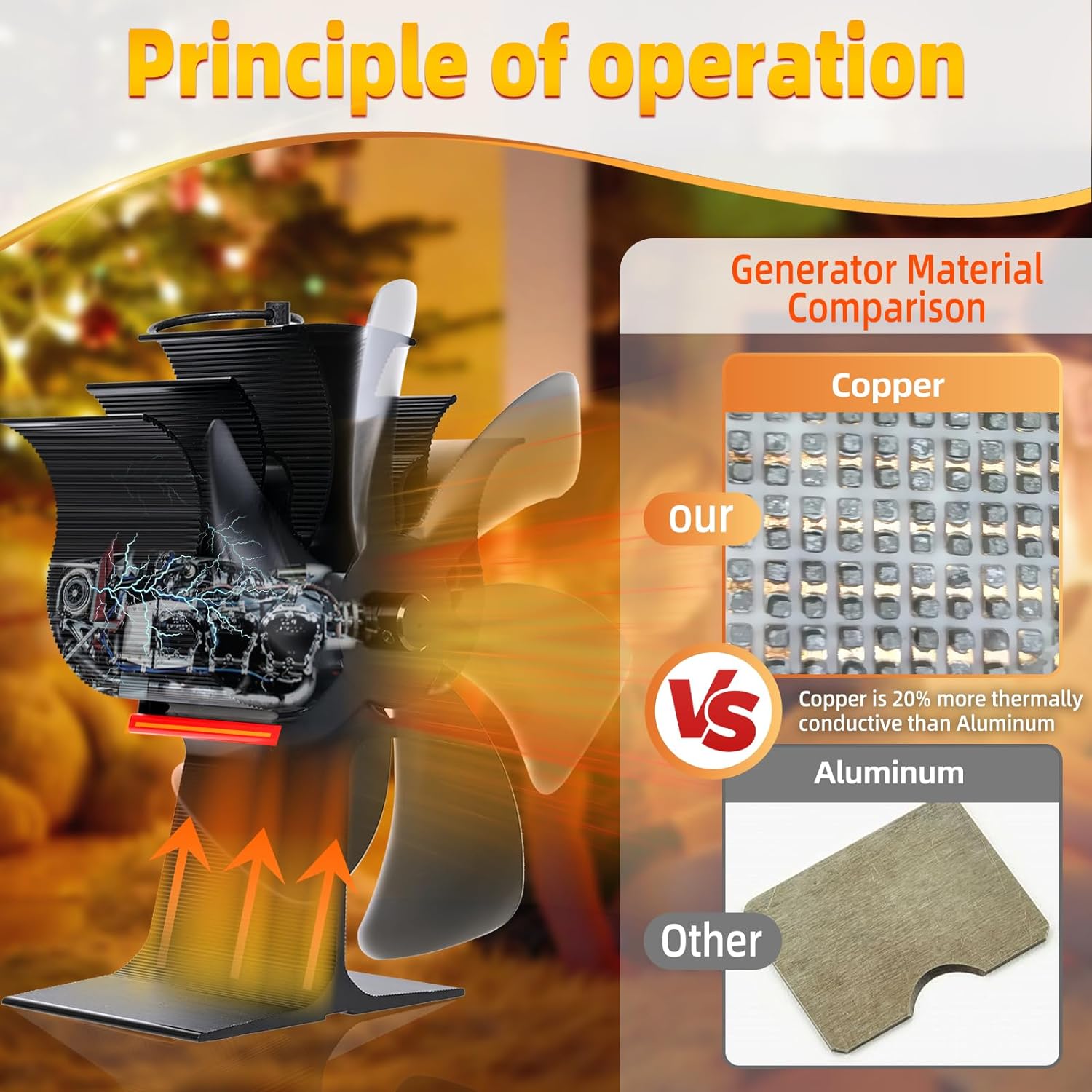 iToolMax Heat Powered Wood Stove Fan requires no electricity or batteries to operate. Powered by recovering heat generated by your stove or fireplace, it drives fans to evenly distribute warm air while pushing heat to every corner of the room. Allowing you to heat more efficiently and save fuel consumption.
