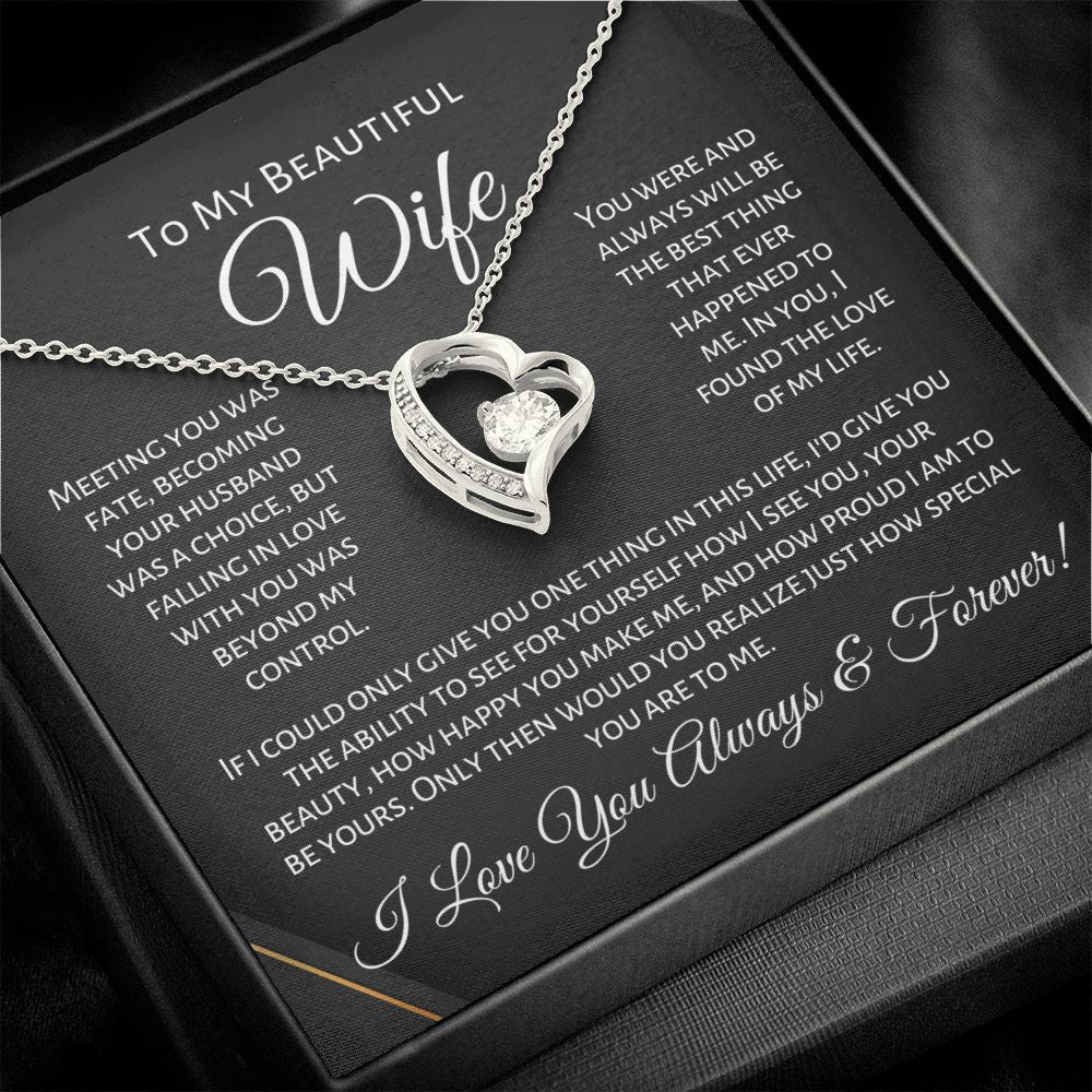 Quote On Card:  "To My Beautiful Wife. Meeting you was fate, becoming your husband was a choice, but falling in love with you was beyond my control. You were and always will be the best thing that ever happened to me. In you, I found the love of my life. If i could only give you one thing in this life, i'd give you the ability to see for yourself how I see you, your beauty, how happy you make me, and how proud i am to be yours. Only then would you realize just how special you are to me. I Love You Always & Forever!"