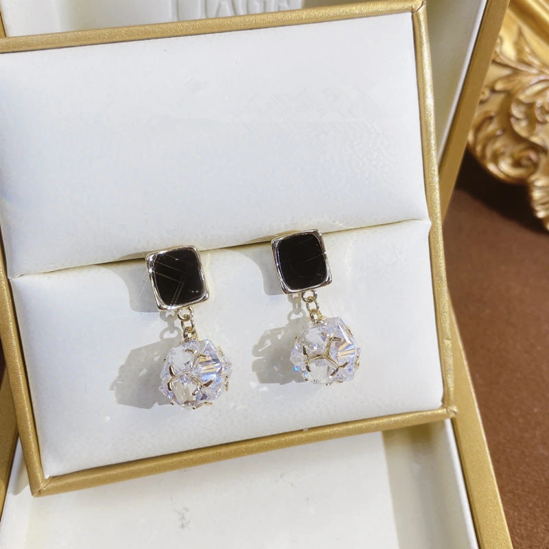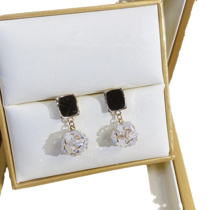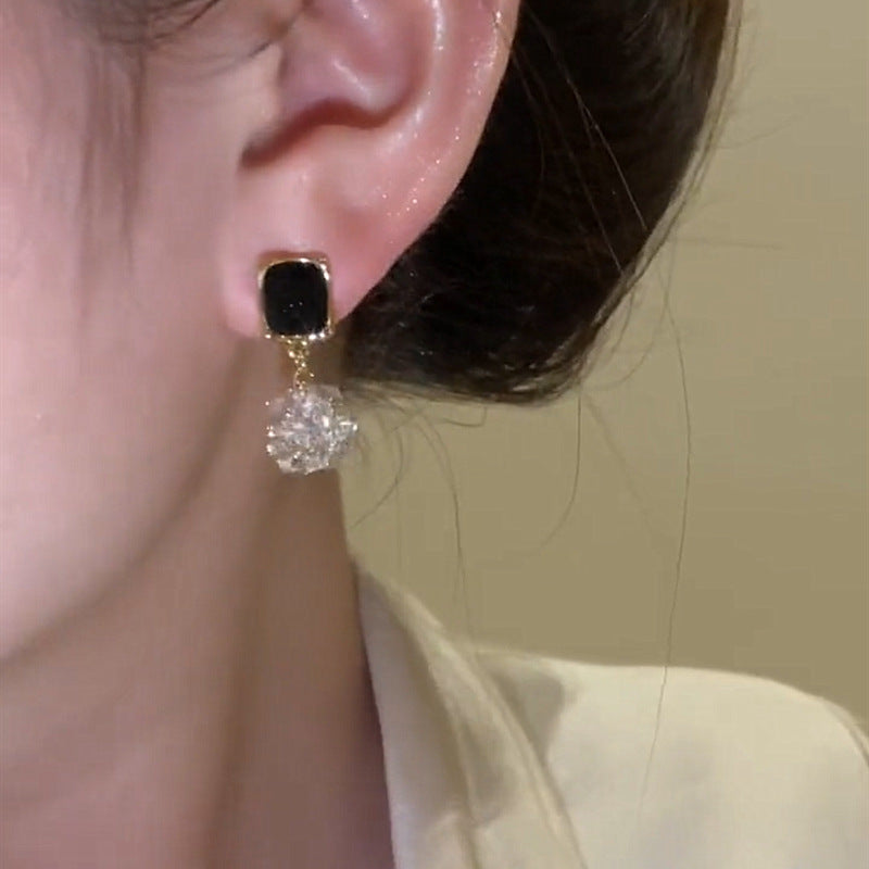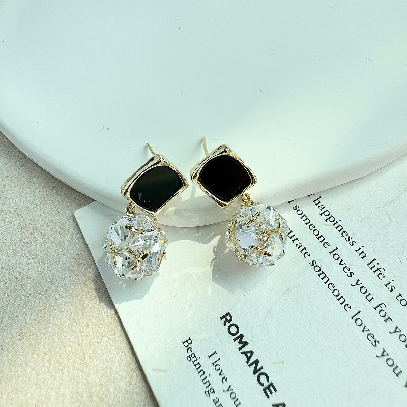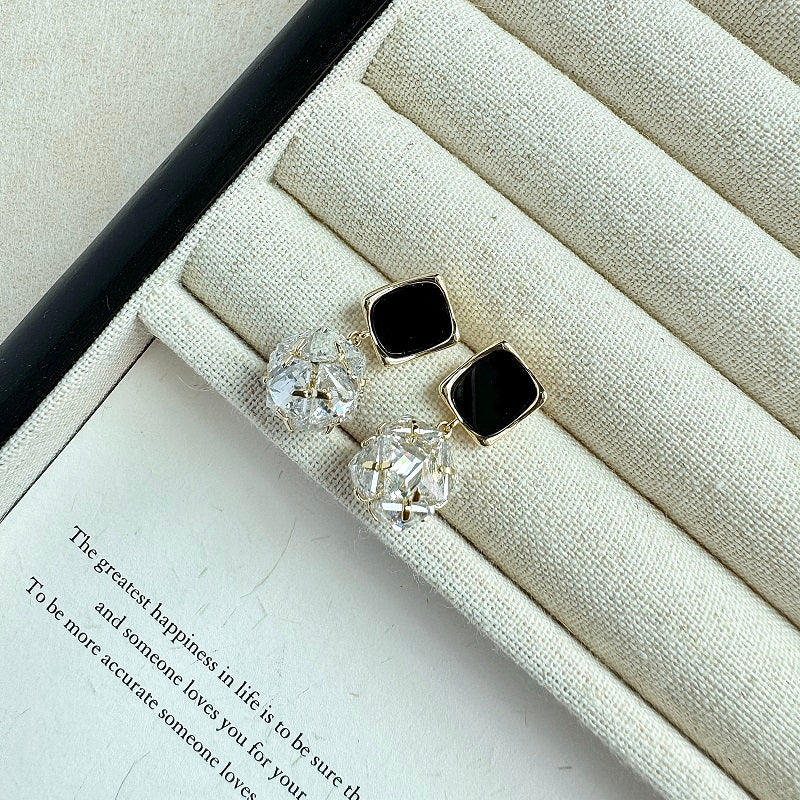 These black square patchwork multi-faceted zirconia earrings present a simple yet sophisticated design. The top half features black squares, a subdued and elegant texture, with a gold-colored border that highlights the nobility of the piece. The bottom half is made up of sparkling multi-faceted zirconias, which reflect the light and add a sense of splendor to the earrings. The overall design retains the contrasting beauty of the classic black color and zirconia, while the simple geometric shapes are modern and stylish, making these earrings suitable for a variety of occasions, especially as an accessory for a dinner party or a party.
