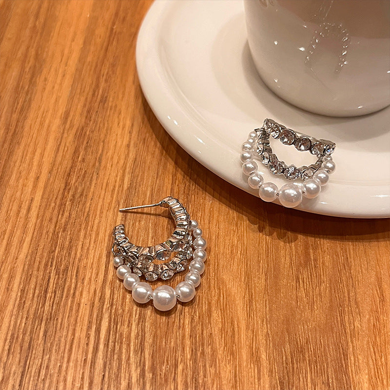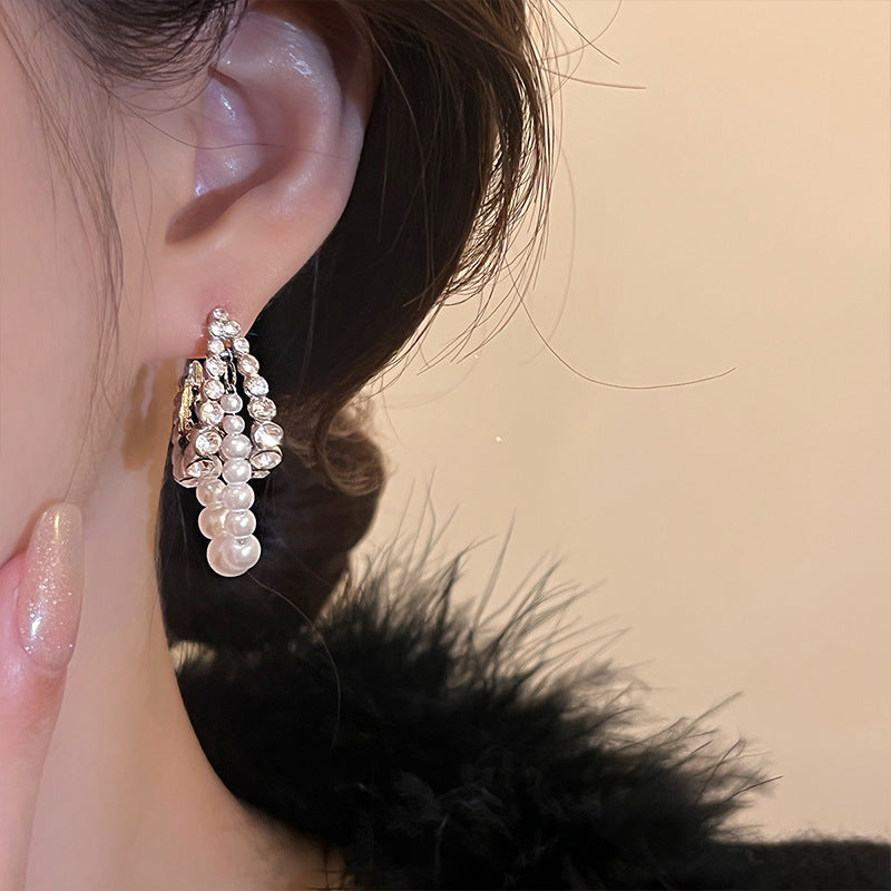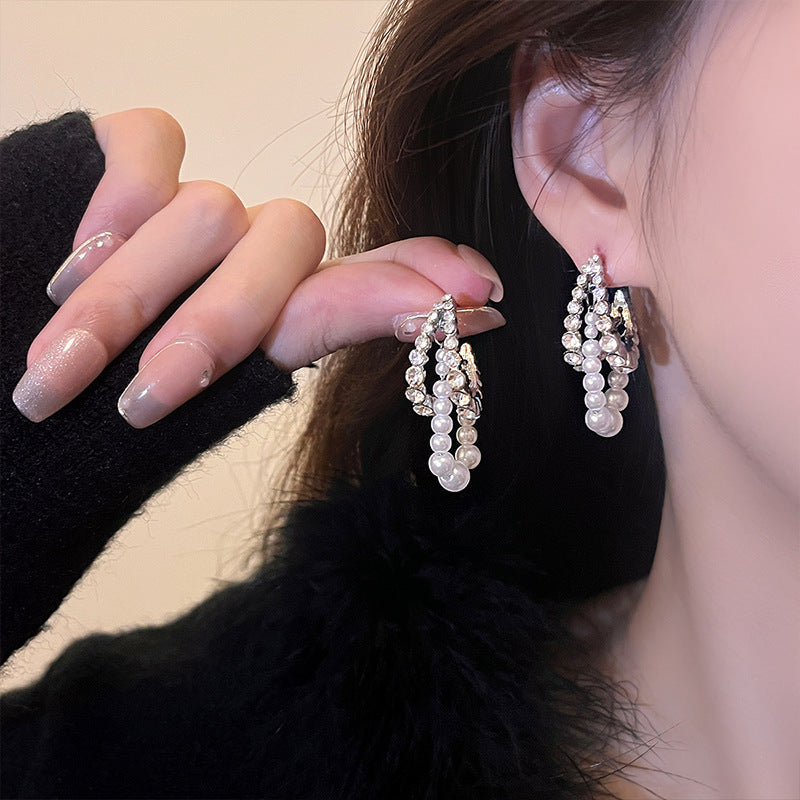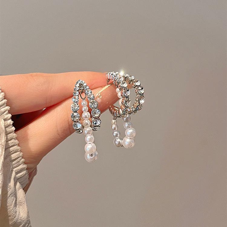 The C-shaped multi-layer zircon and pearl tassel earrings are a refined piece of jewelry that blends elegance with dynamism. The overall structure of the earrings features a graceful C-shaped curve. The C-shaped section is adorned with multiple layers of delicate zircon stones, meticulously arranged in a staggered pattern. The zircon stones are finely cut, allowing the earrings to sparkle brilliantly in the light, showcasing a dazzling visual effect.