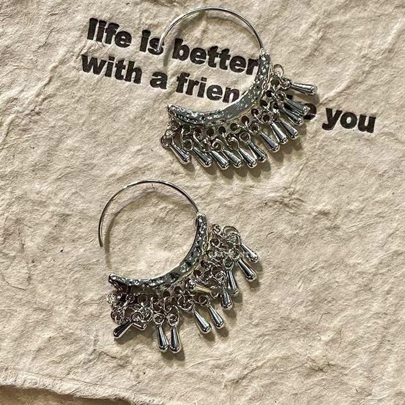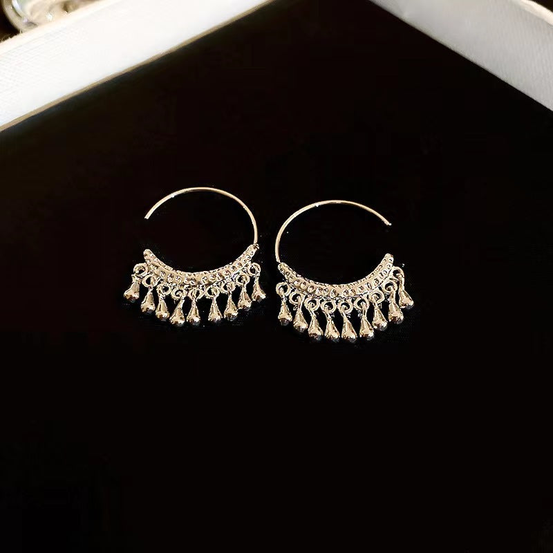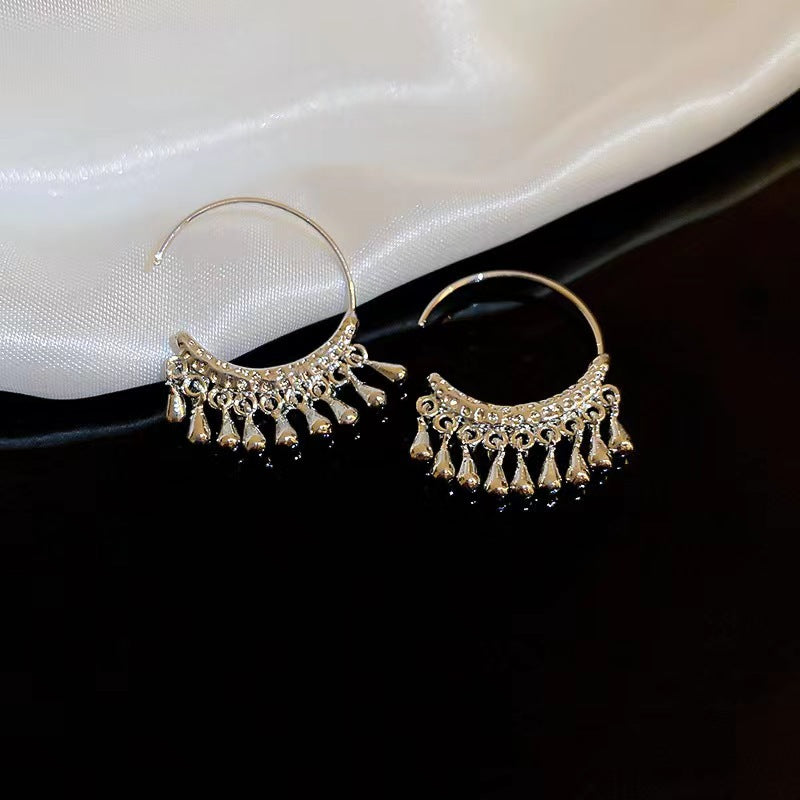 Overall, these earrings feature the simplicity and sophistication of circles, the elegance of teardrops, and the flowing grace of tassels, making them suitable for various occasions.