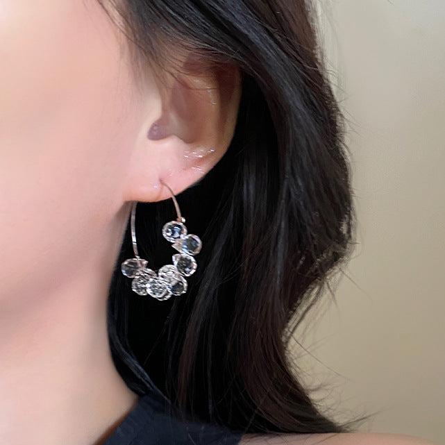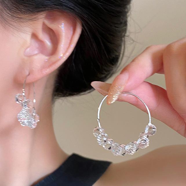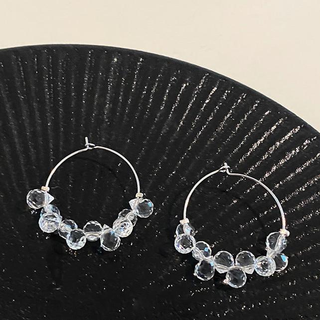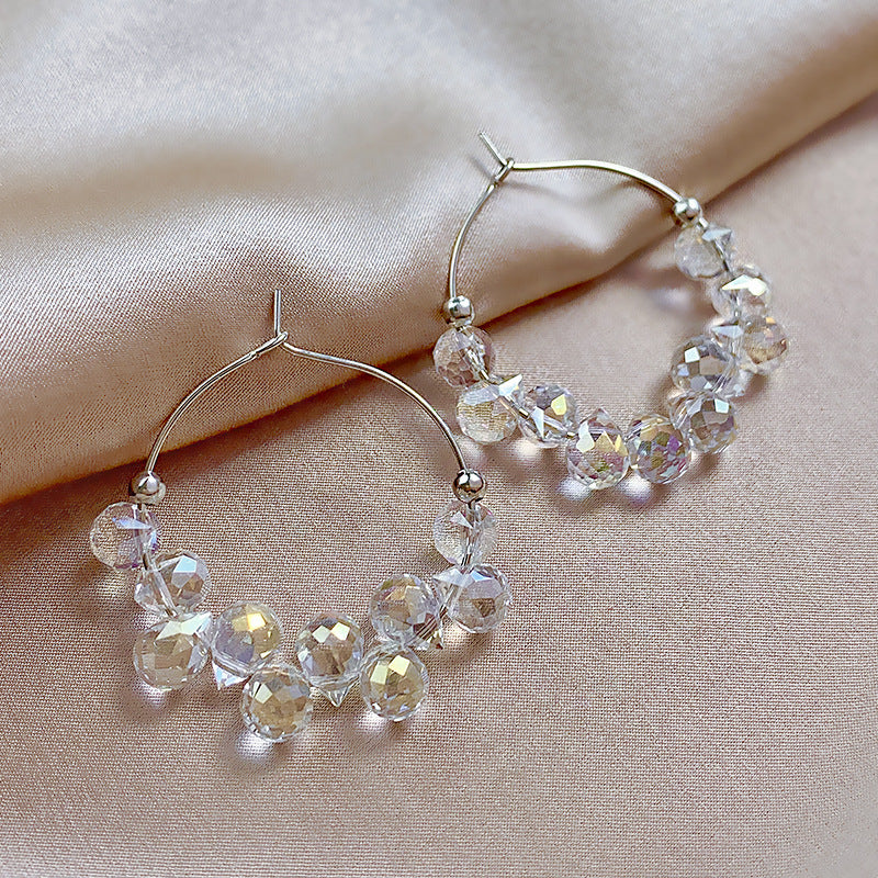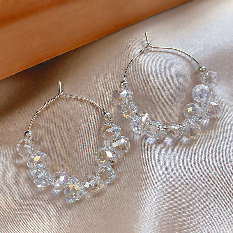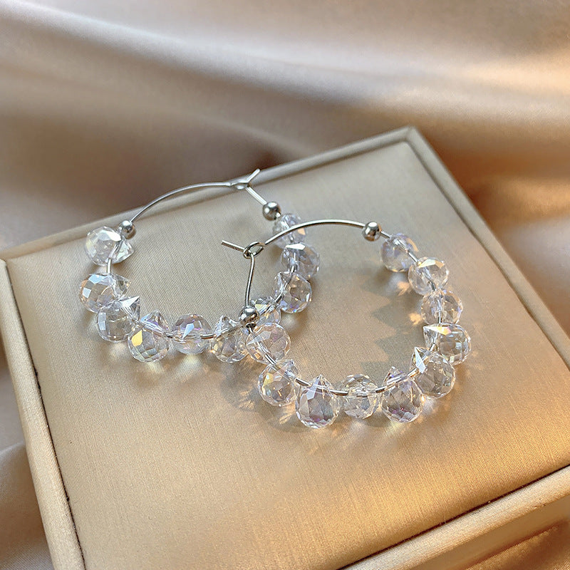 This pair of crystal beaded hoop earrings features a refined design and a captivating brilliance. The earrings consist of a circle of exquisite crystal beads, each meticulously cut to catch the light and sparkle beautifully. The hoop shape is simple yet elegant, blending modernity with a touch of fashion.