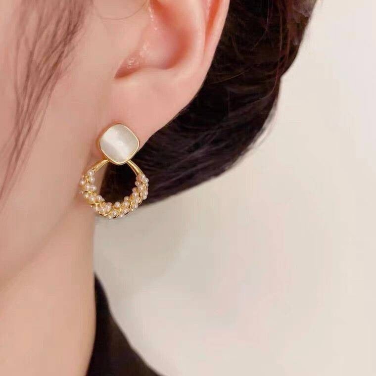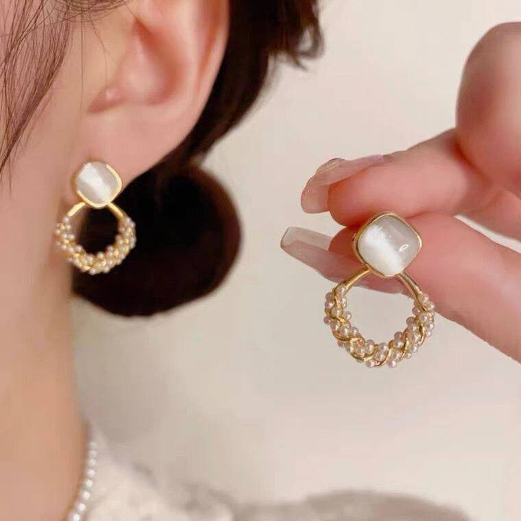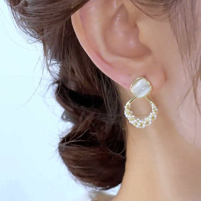 The mini cat's eye stone and pearl earrings are a delicate piece of jewelry. The earrings feature a diamond-shaped design, showcasing a unique geometric aesthetic. The cat's eye stone, as the main gemstone, exhibits a distinctive optical effect, with a fine "cat's eye" shimmer that appears when light reflects off the surface, giving it a sense of mystery and elegance. The stone's color is often a soft pale green or bluish-gray, complementing the overall minimalist design of the earrings.
