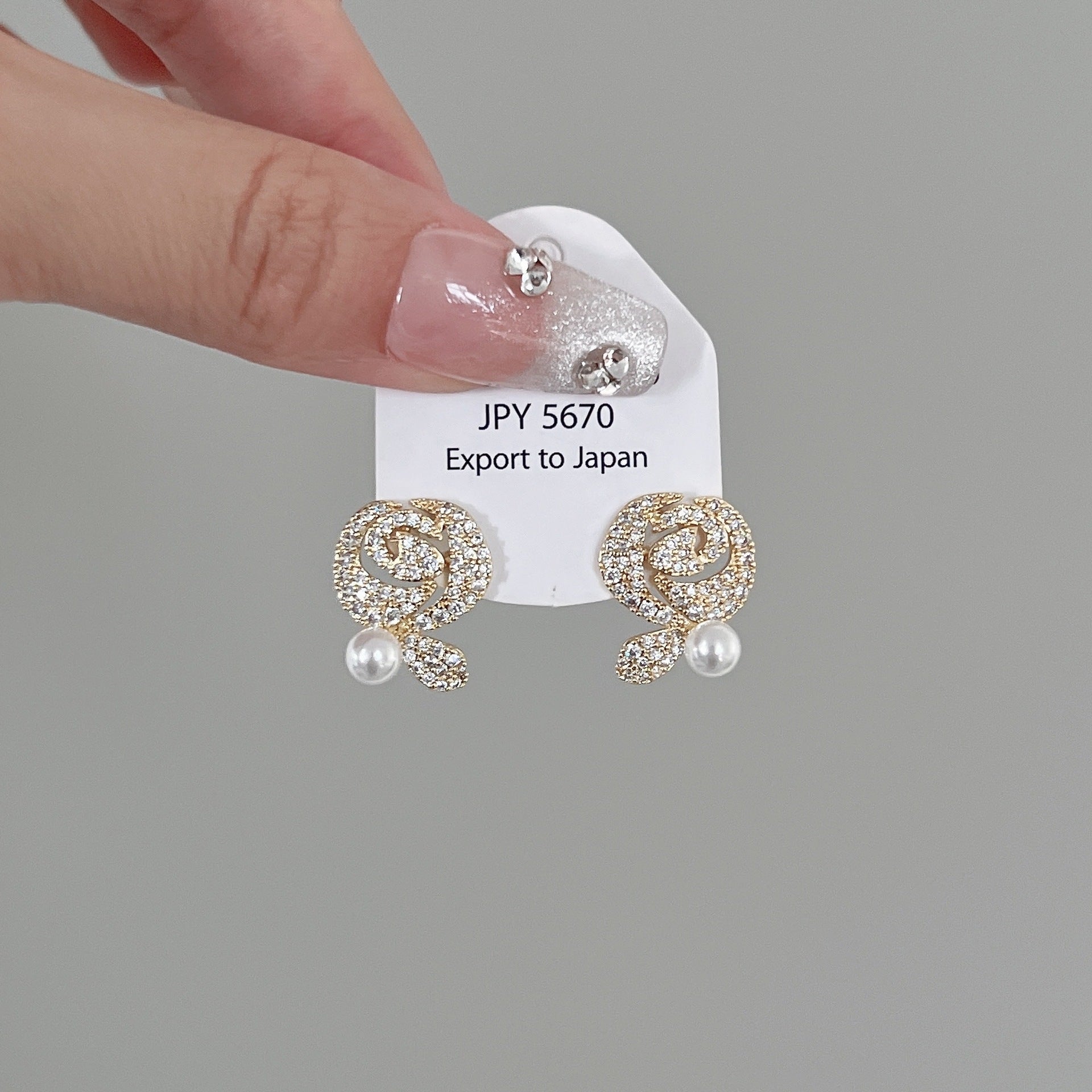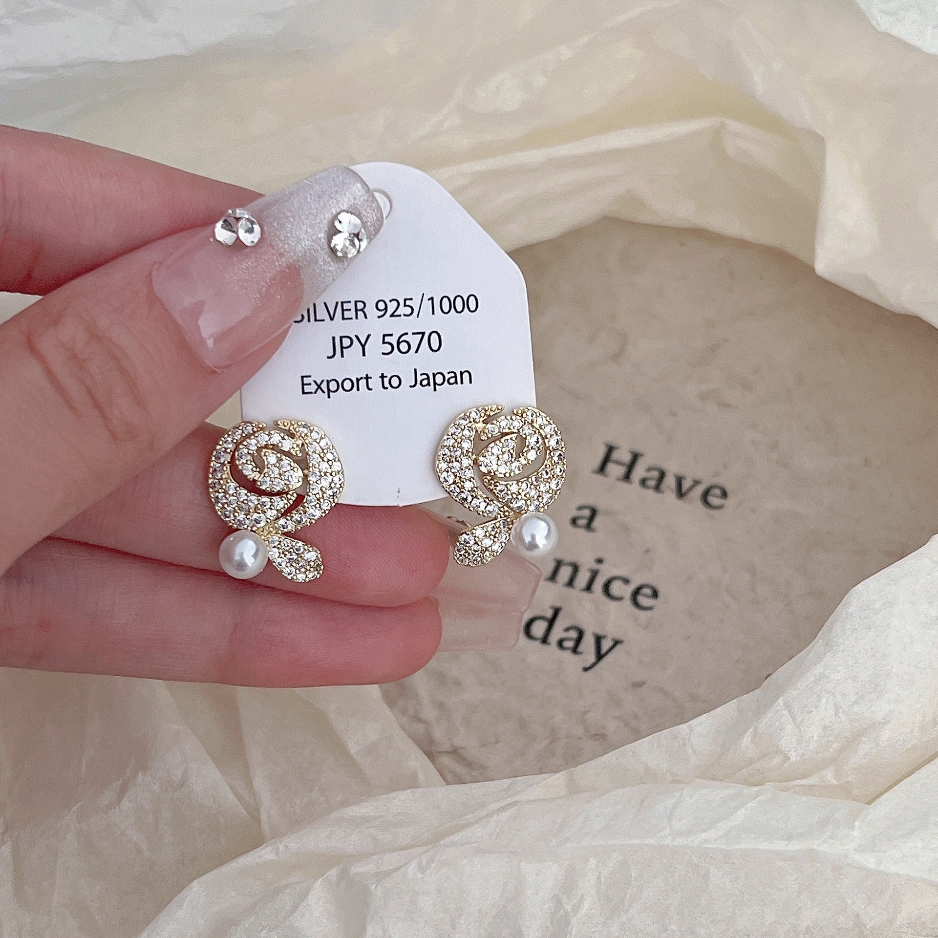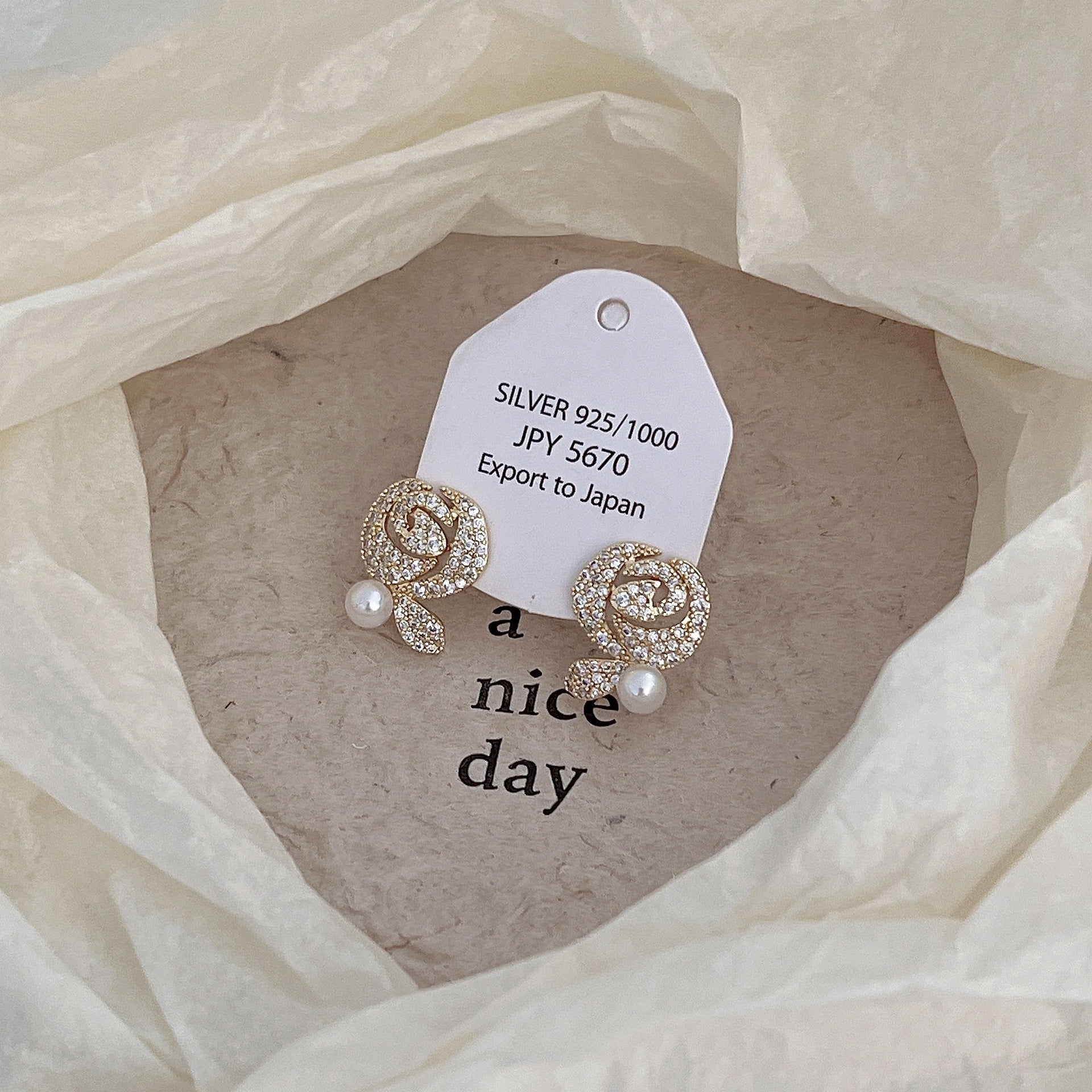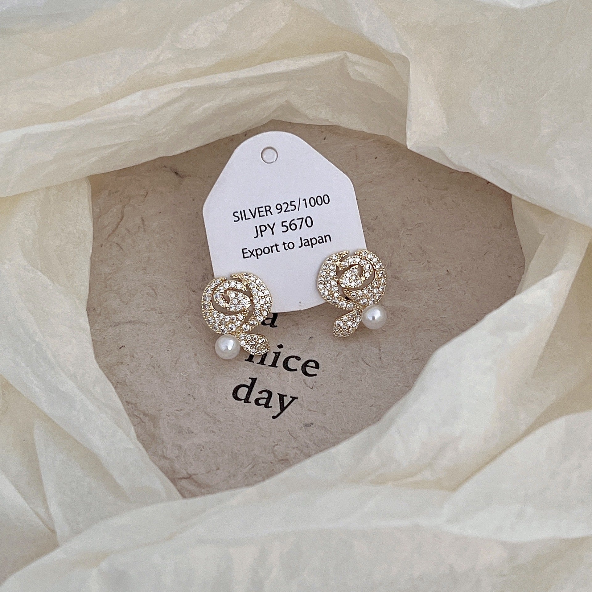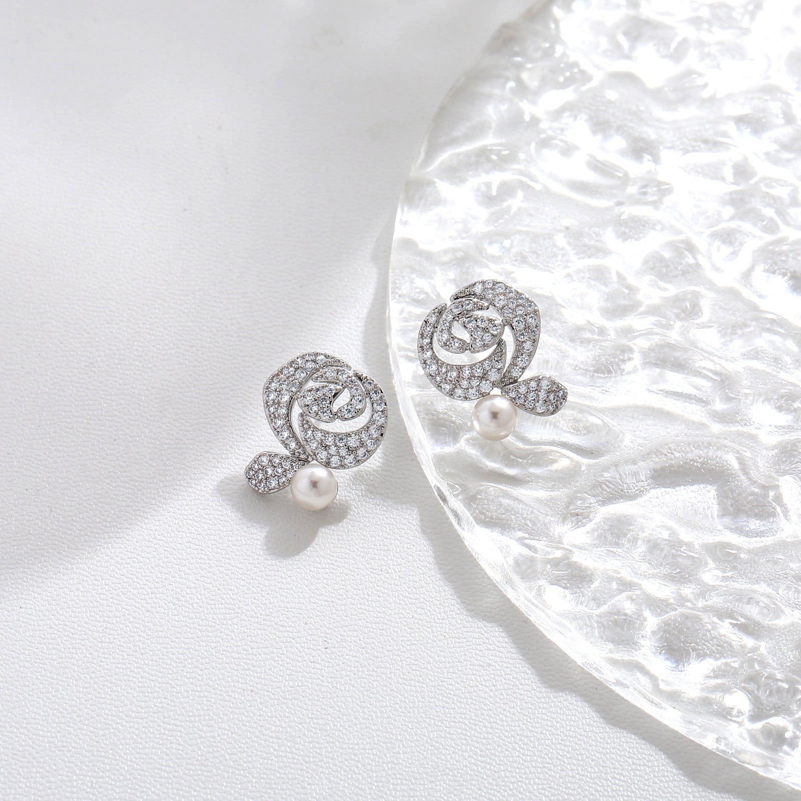 In the center or at the base of the rose, a full, lustrous pearl is typically suspended or set. The soft sheen of the pearl contrasts elegantly with the brilliance of the zircons, making the earrings look even more delicate and graceful.
