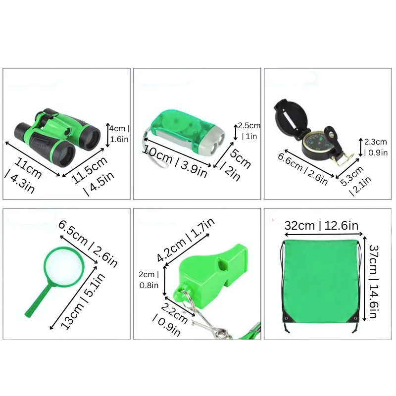 • Set Includes: 1x Binoculars, 1x Magnifying Glasses, 1x Torch, 1x Compass, 1x Fox Whistle & 1x Bag