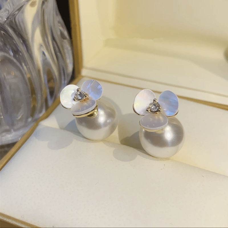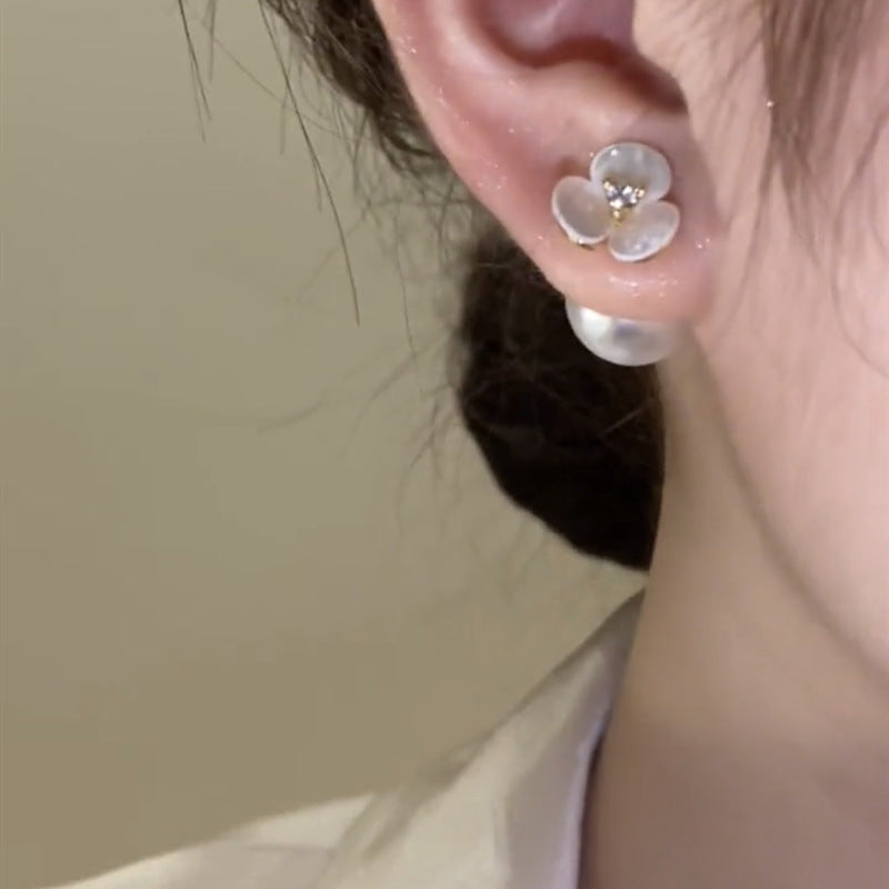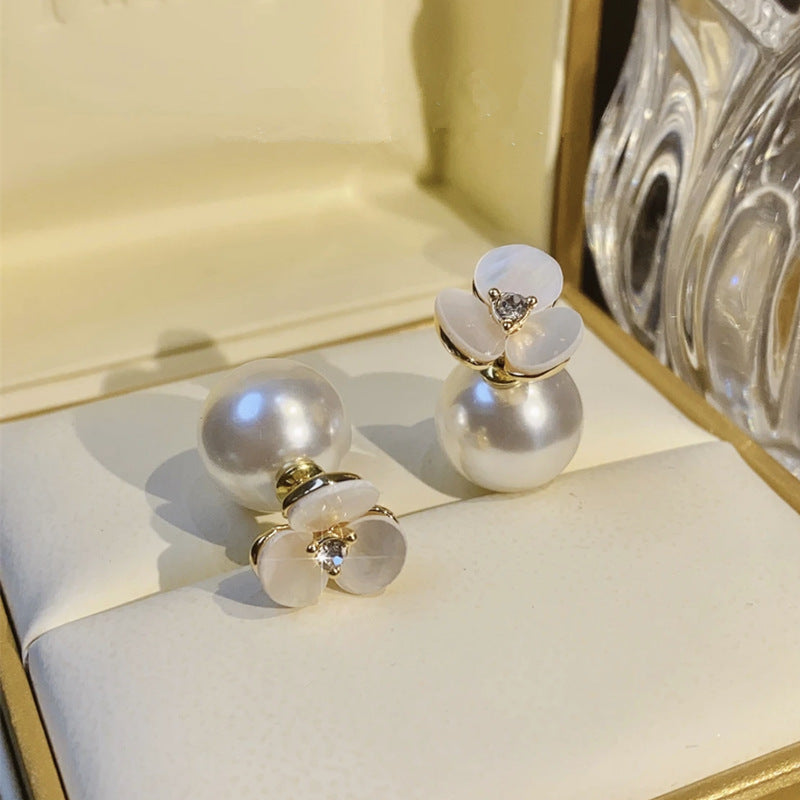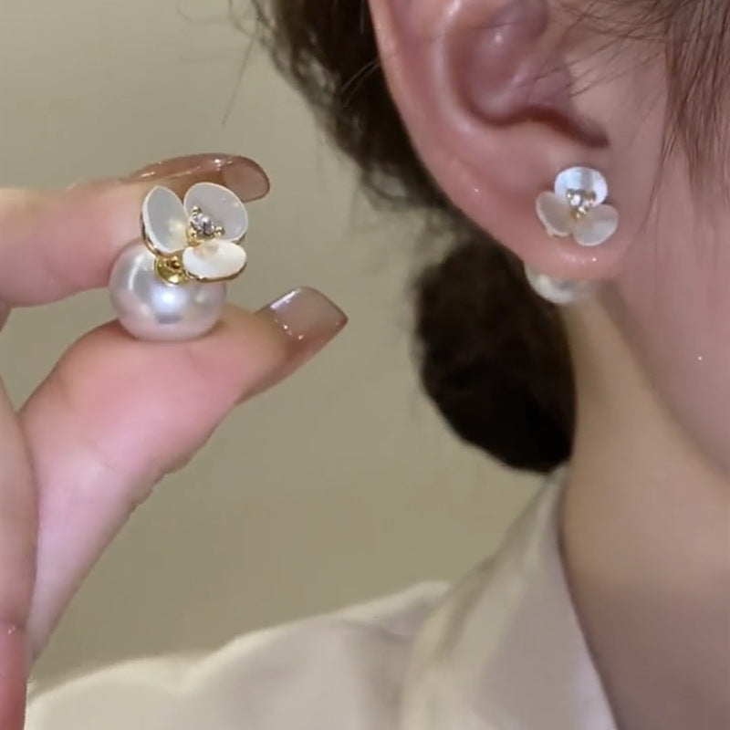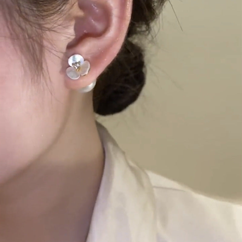 These French Sweet Shell Flower Pearl Stud Earrings feature a romantic design and a variety of wearing styles. The studs feature a combination of delicate shell flowers and round pearls, with the shell flowers displaying a soft luster for a fresh, natural vibe, while the pearls exude an elegant luster. The uniqueness lies in the two ways of wearing the earrings, either with the flowers facing forward for a sweet and romantic atmosphere, or with the pearls facing forward for a simple and elegant texture.