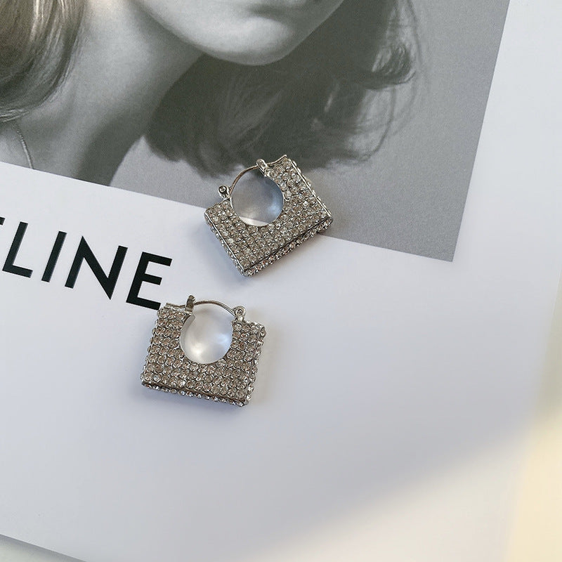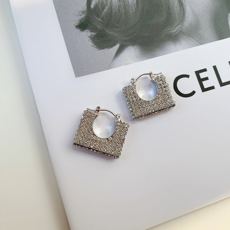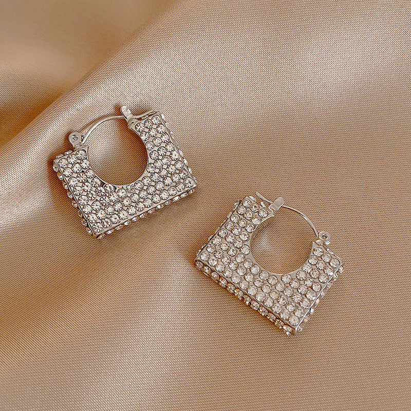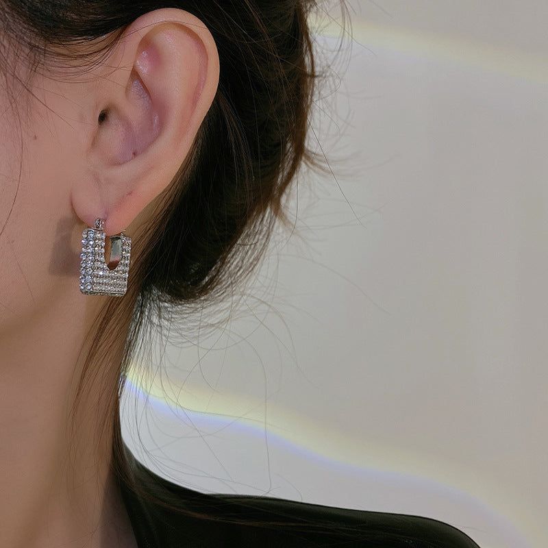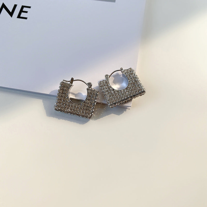 These earrings feature a unique square-shaped design, resembling a mini frame with a hollowed-out center. The surface of the earrings is densely encrusted with small, sparkling zircon, creating a dazzling, lustrous appearance. The embellishments on the front are neatly arranged, smooth, and tightly packed, reflecting light in a way that makes the earrings look luxurious and refined.