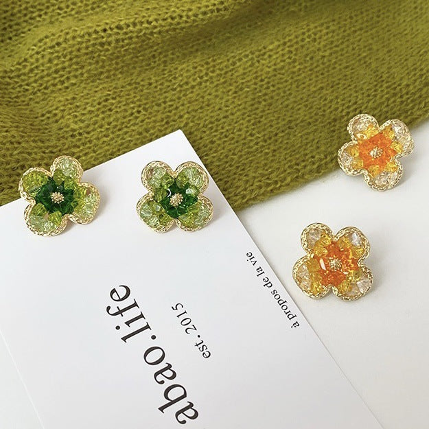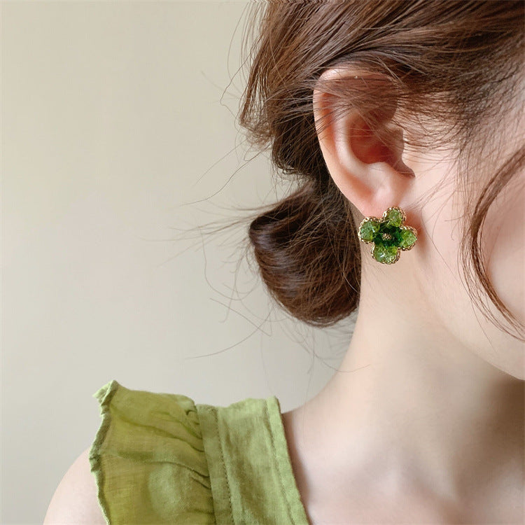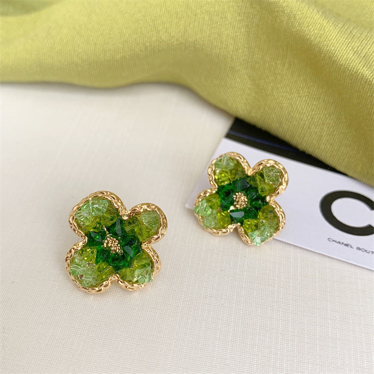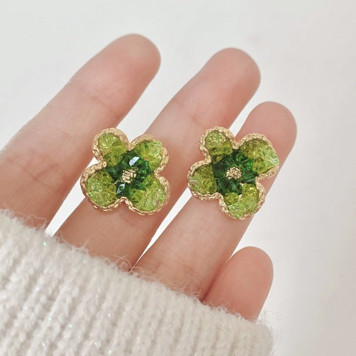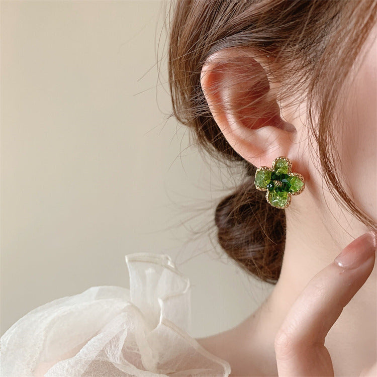 These gradient crystal green flower earrings display a fresh and dynamic vibe, blending natural elements with stylish design. Each pair of earrings features a green crystal flower that exudes an enchanting glow and mysterious aura. The green crystals show a fascinating gradation of colors from dark to light, as if it were a dreamy emerald green world.
