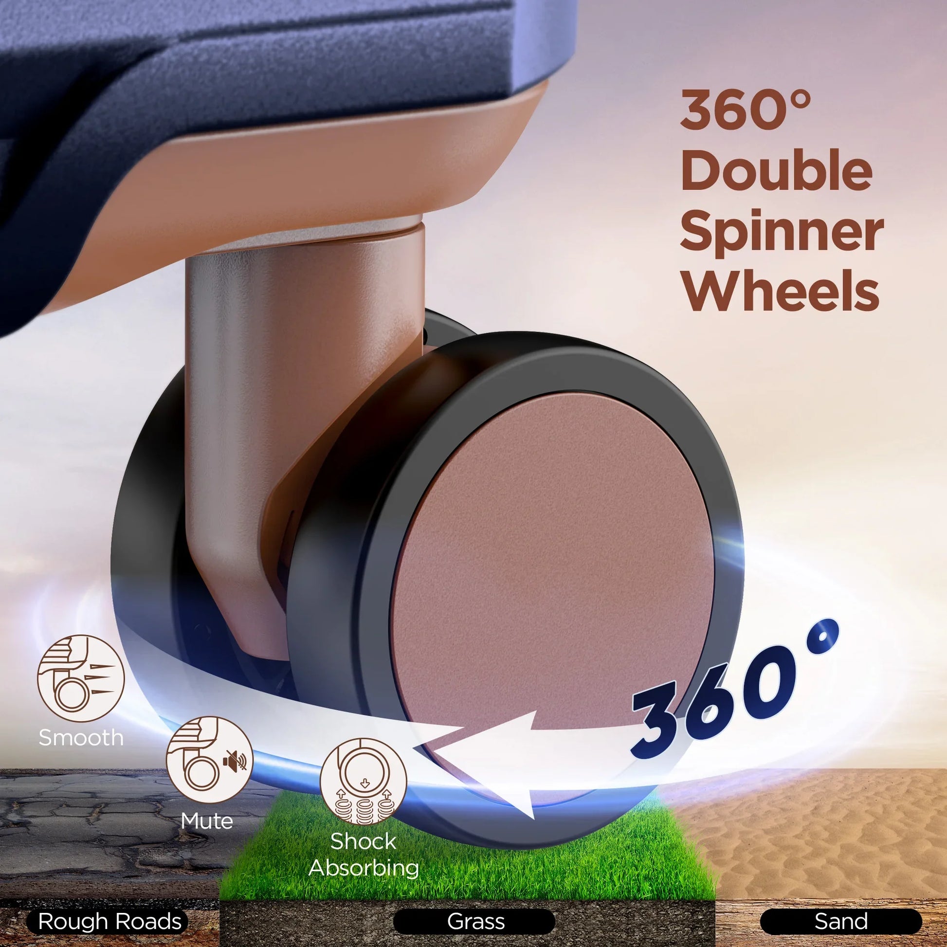 • 360° Spinner Wheels: Smooth, quiet maneuvering on all surfaces – from airports to hotel lobbies.