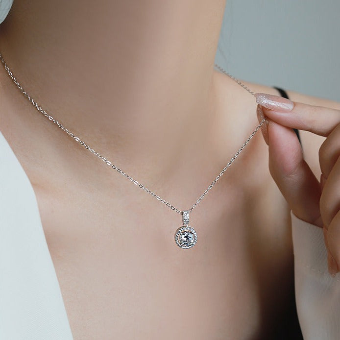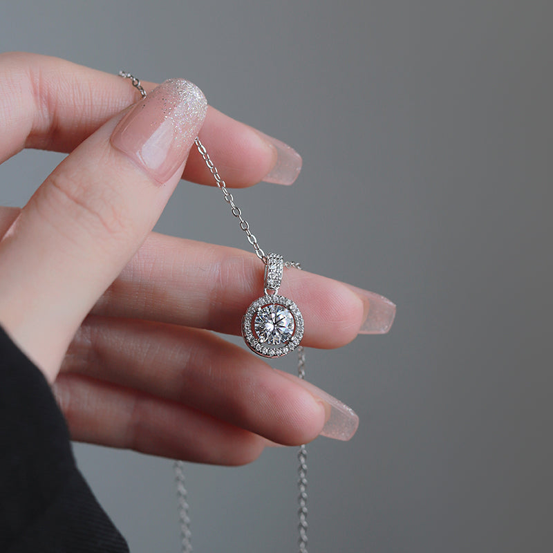 The center of the necklace is set with a one carat zircon or moissanite, your choice of material depending on your personal preference. Both the zircon and moissanite are finely cut and polished to reveal a sparkle that rivals that of diamonds. Zircon is crystal clear and brilliant, while moissanite wins the hearts of jewelry lovers with its ultra-high refractive index and unique fire.