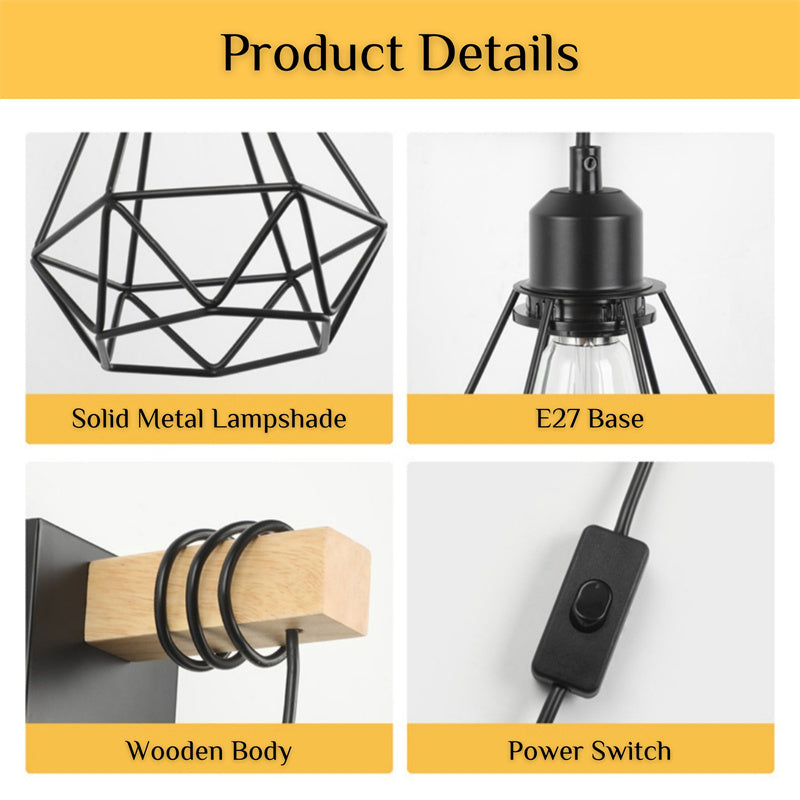 This plug-in wall light features a wall-mounted design and metal base with a matte black finish for an attractive look. The solid wood material and diamond cage shade make these plug-in wall lights a great decorative lighting choice, perfect for adding a touch of color to your home.