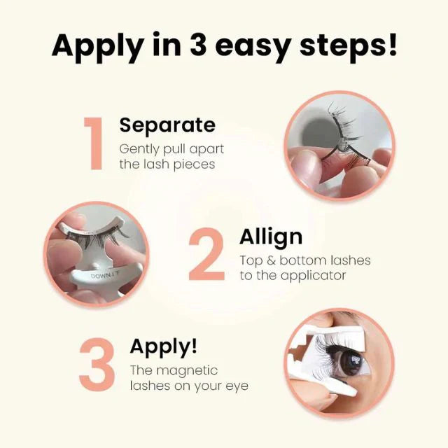 Application is quick and effortless: simply position the top lash above your natural lashes, align the bottom lash underneath, and let the magnets lock together. In just seconds, you’ll have full, voluminous lashes that enhance your natural beauty.