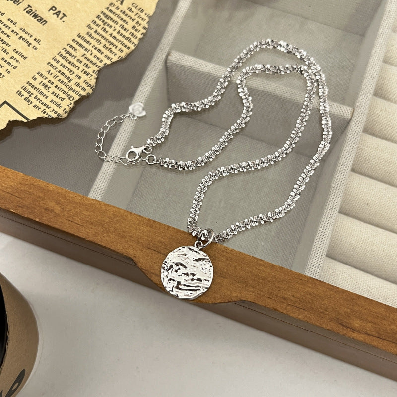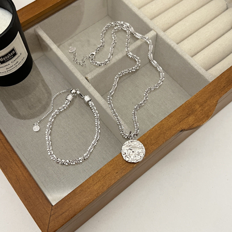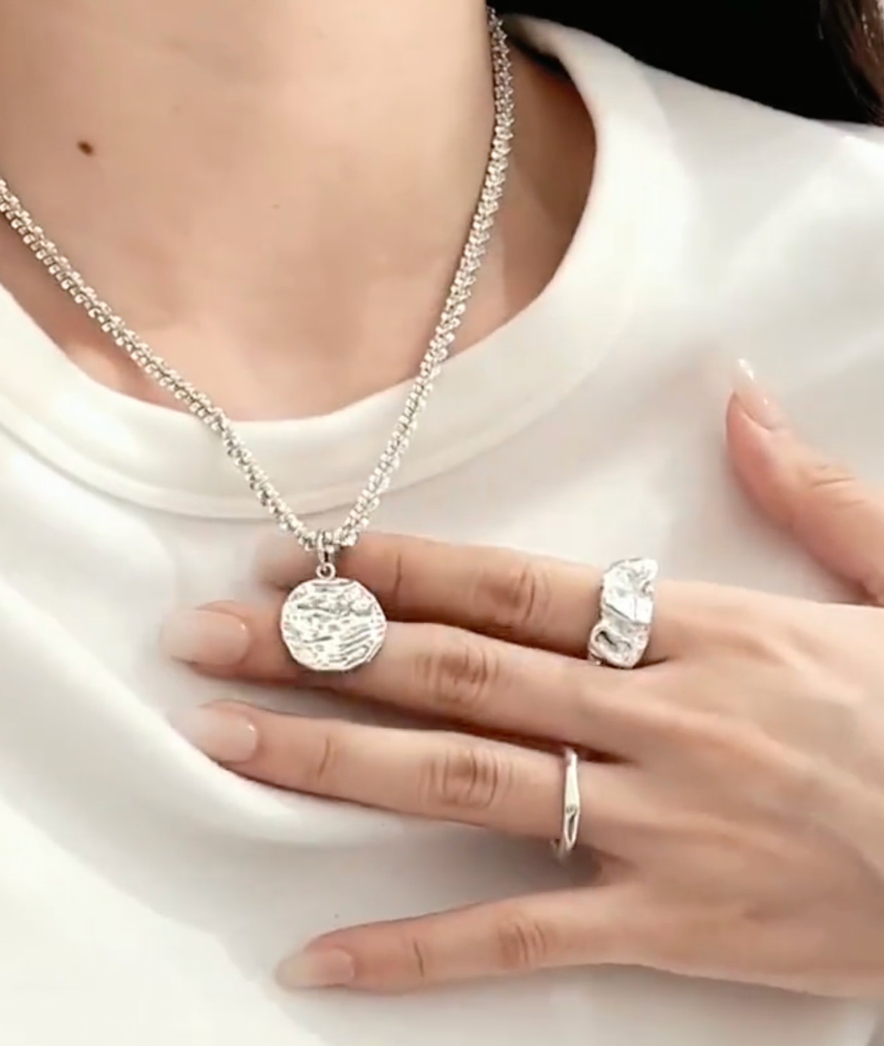 This Irregular Textured Pendant Necklace is a unique and sophisticated jewelry design that presents a unique artistic aesthetic. The pendant may be round in shape, presenting an abstract texture of myriad textures, showing a modern and stylish vibe.