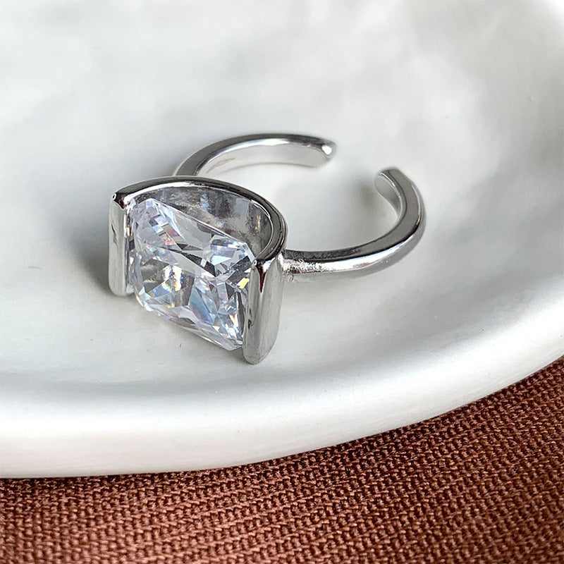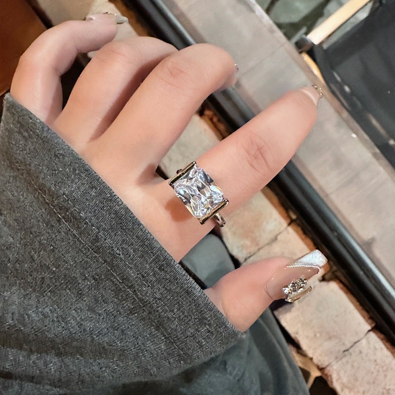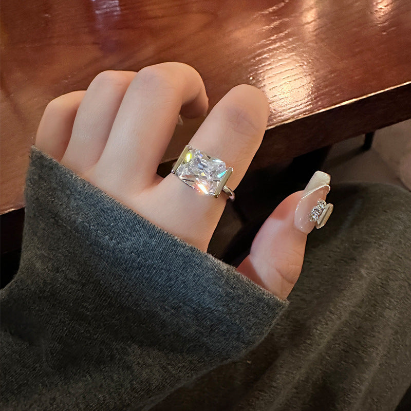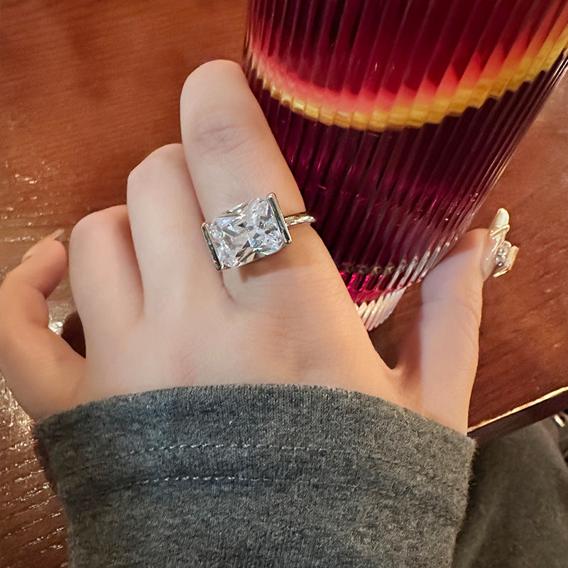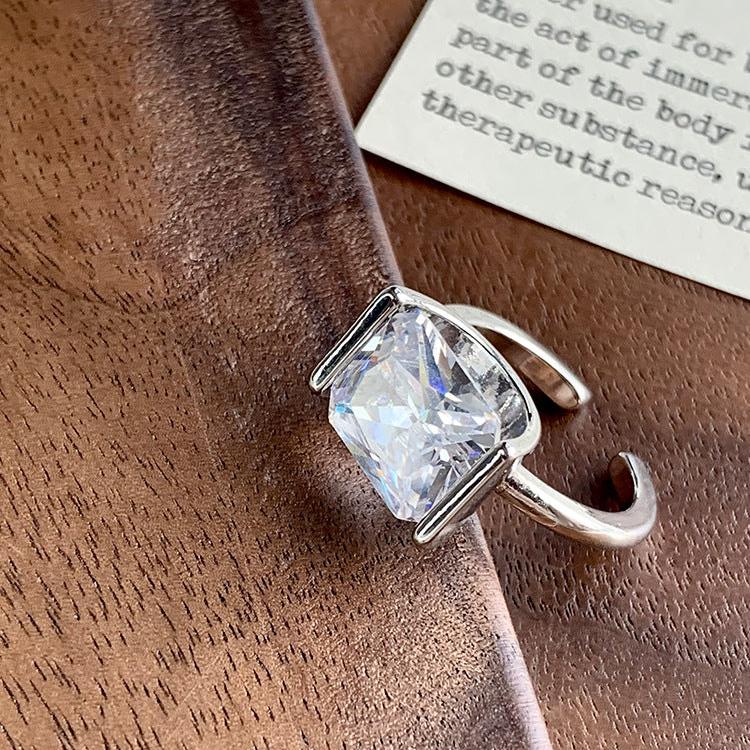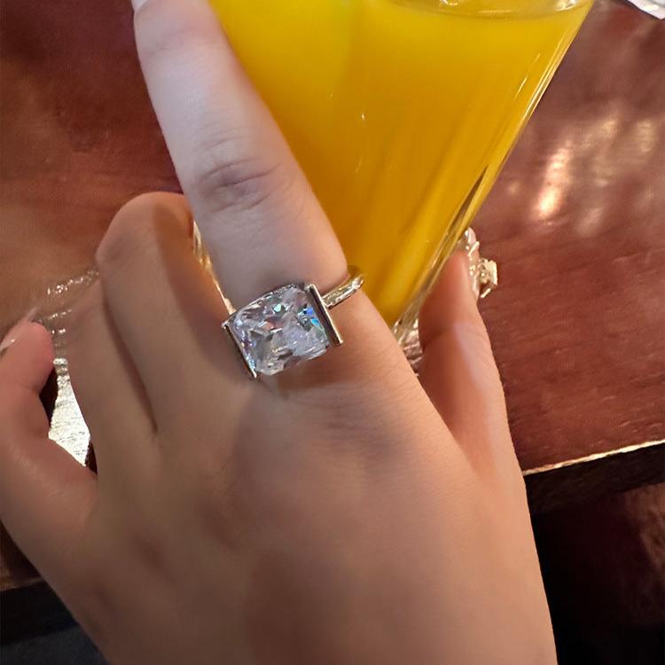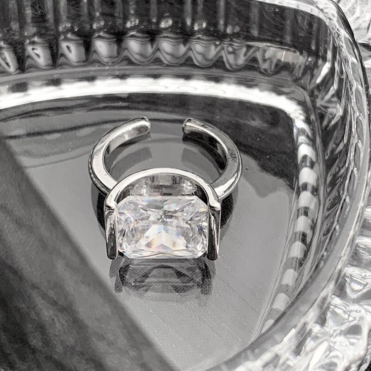 The large zircon is cut into a square shape, with a smooth surface and high gloss, resembling the brilliance of a diamond. The zircon is of a significant size, usually occupying the central position of the ring, making it the visual focal point of the entire piece.