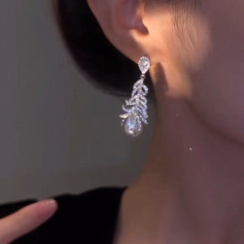 The main part of the earrings is in the shape of a delicate feather, with every detail of the feather micro-set with sparkling zirconia. The zirconia stones are finely cut and set to reveal a radiant glow, as if the feather were glittering in the sunlight. The zircons are closely and evenly arranged, making the feather look extraordinarily gorgeous and noble, displaying a unique charm. The shape of the feather is elegant and dynamic, as if it is floating with the wind, showing a light posture.