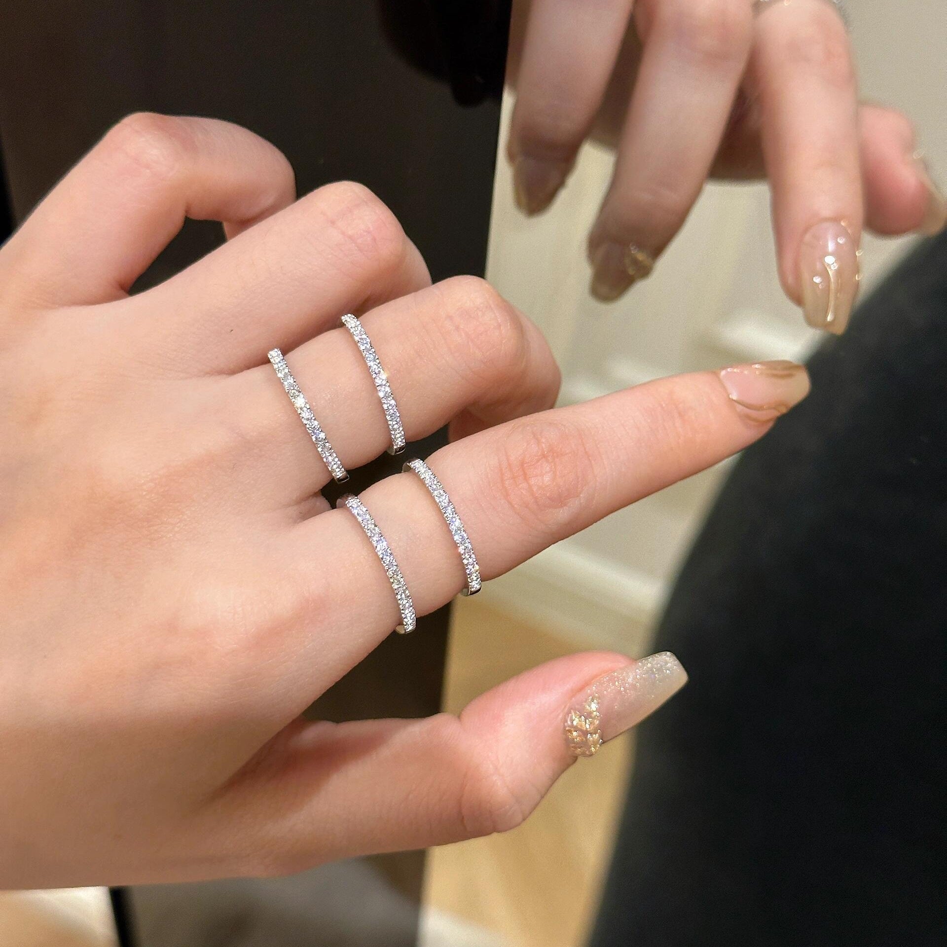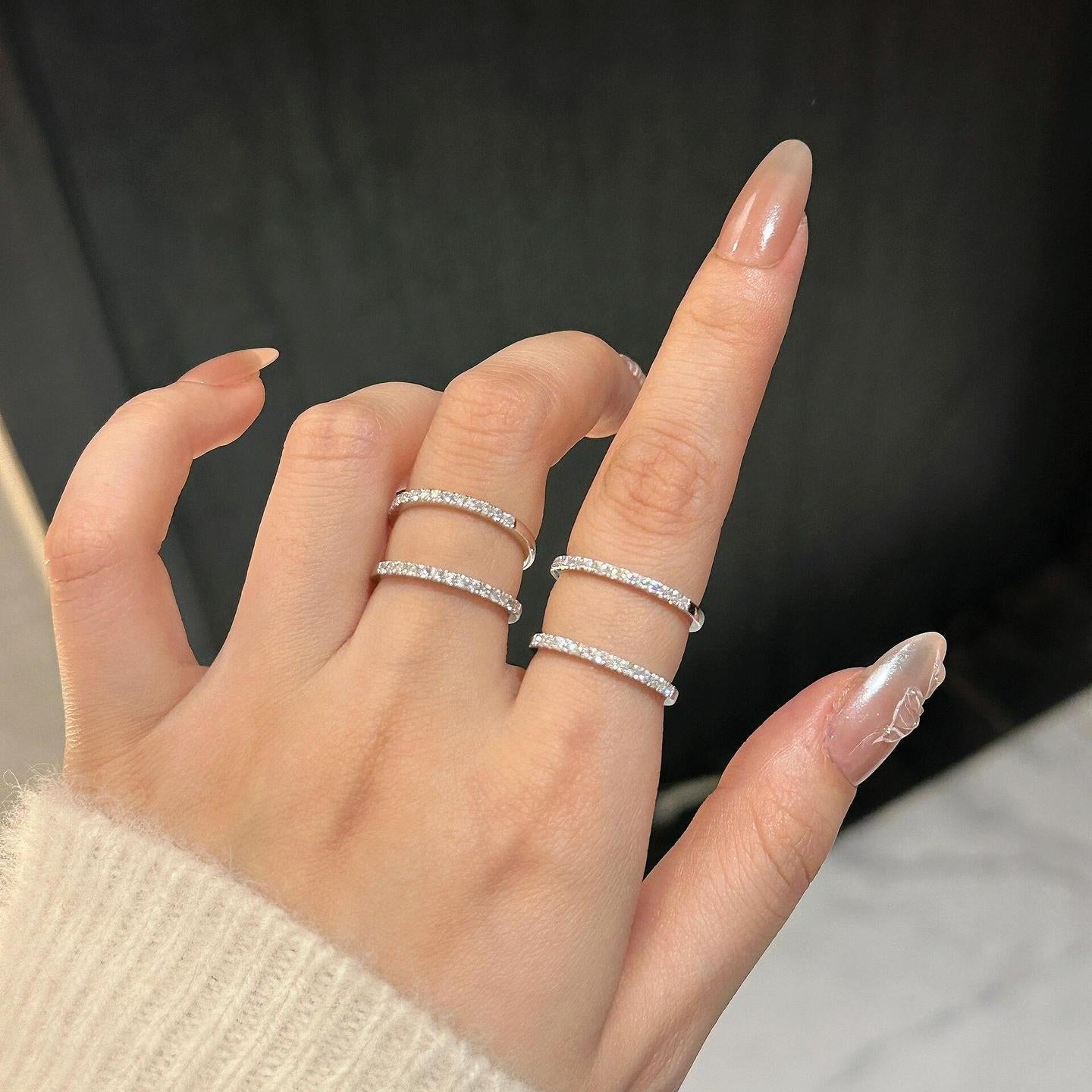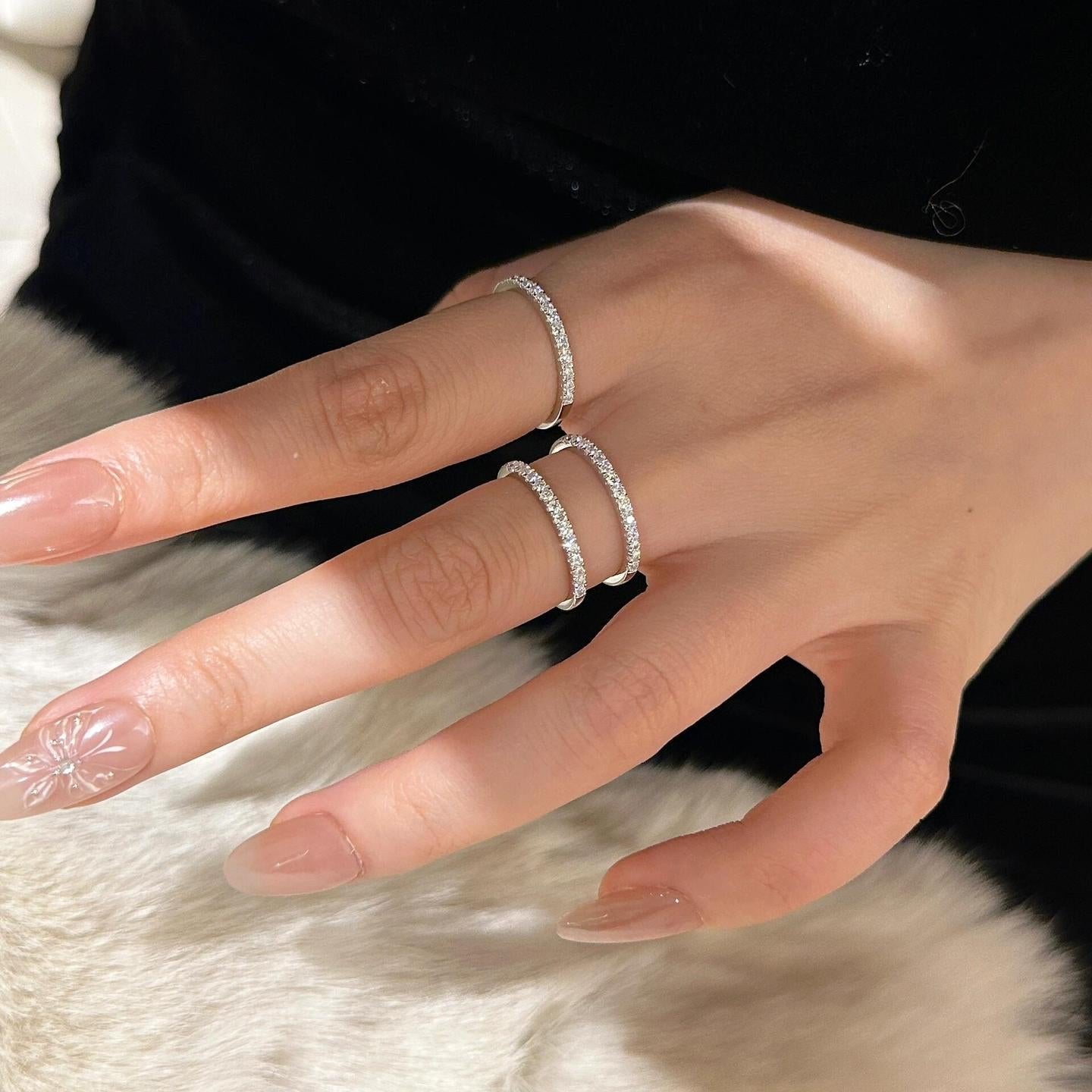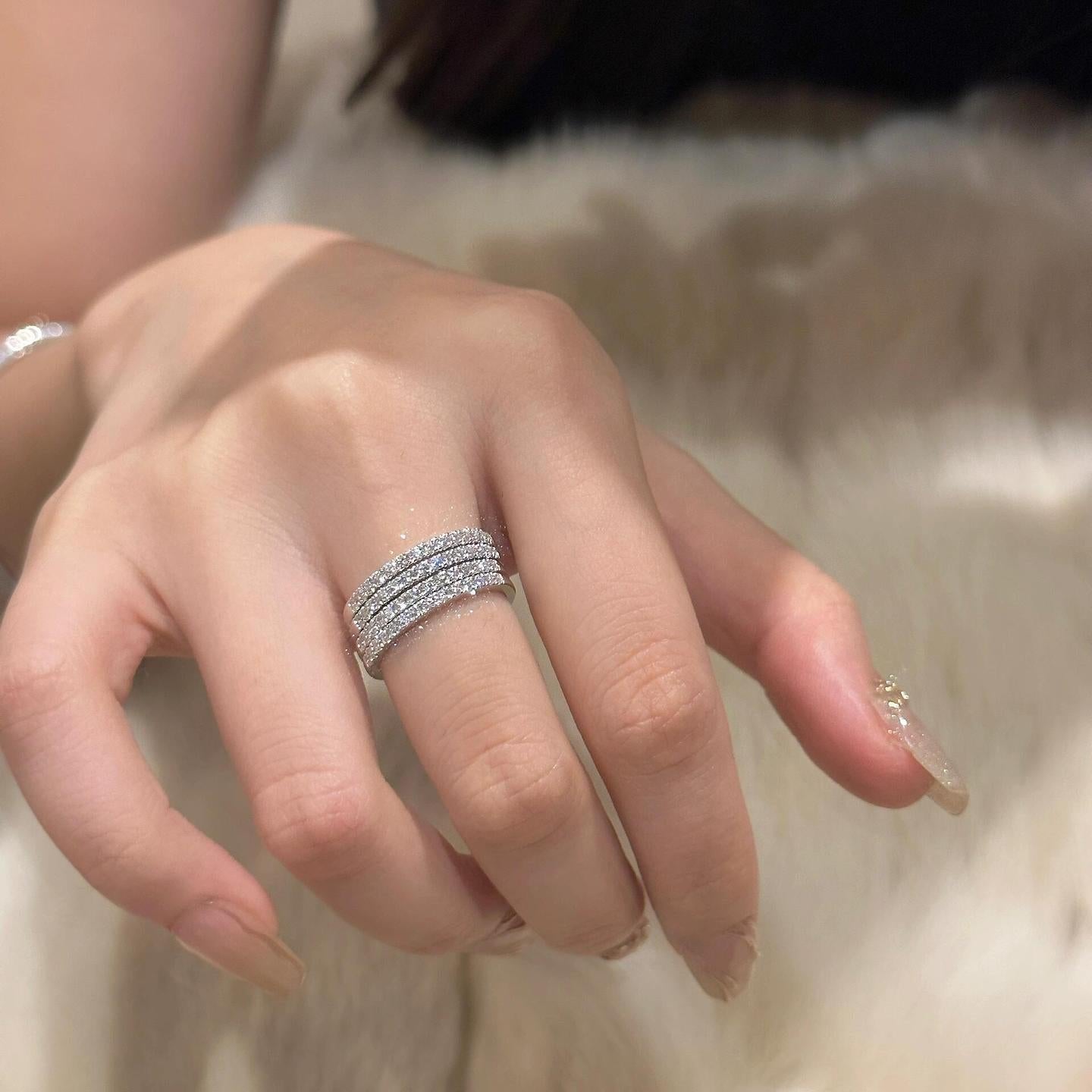 Crafted from high-quality sterling silver, this minimalist sterling silver row ring with crushed diamonds displays an understated yet glamorous shine. Its simple and stylish design makes it suitable to be worn alone to emphasize the wearer's elegance, or stacked with other rings to create a multi-layered fashion effect.