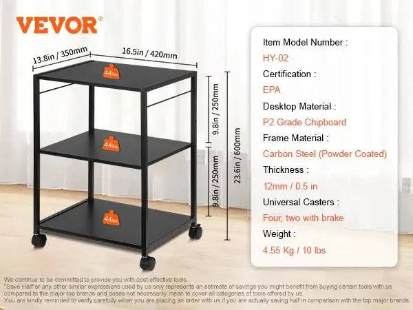 Weighing only 4.55 kg (10 lbs), the stand can hold up to 20 kg (44 lbs) on each of its three tiers, making it suitable for heavier items like printers, scanners, or office equipment.