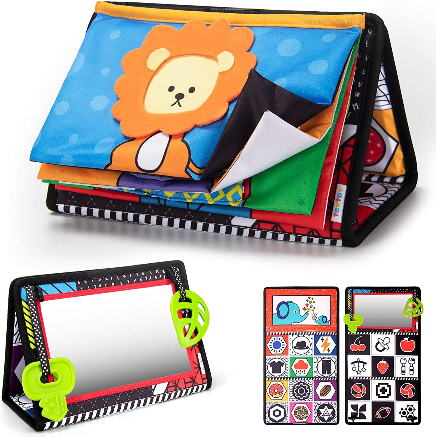 šŸ‘¶ 3-IN-1 TUMMY TIME TOYS FOR BRAIN DEVELOPMENT: Our 3-in-1 Tummy Time Toy Set is essential for newborn brain development! It includes a baby-safe mirror for imitation, a high-contrast black and white cloth book for early reading, a baby teether, and a baby rattle/squeaker to grab your little one's attention.