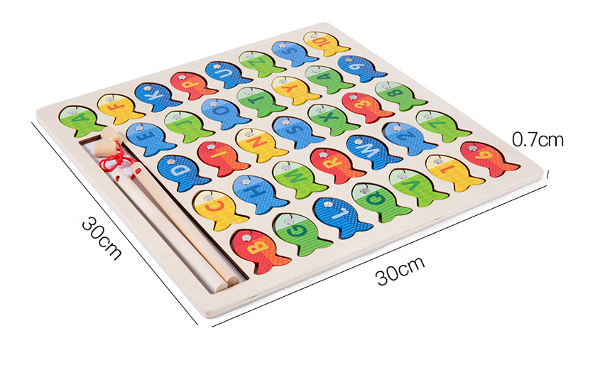 Our fishing game features a vibrant wooden board with fish pieces marked with different letters and numbers. Using the special fishing pole, your child will "catch" the fish, learning to recognize colors, letters, and numbers. This engaging activity encourages early learning in a fun and interactive way.