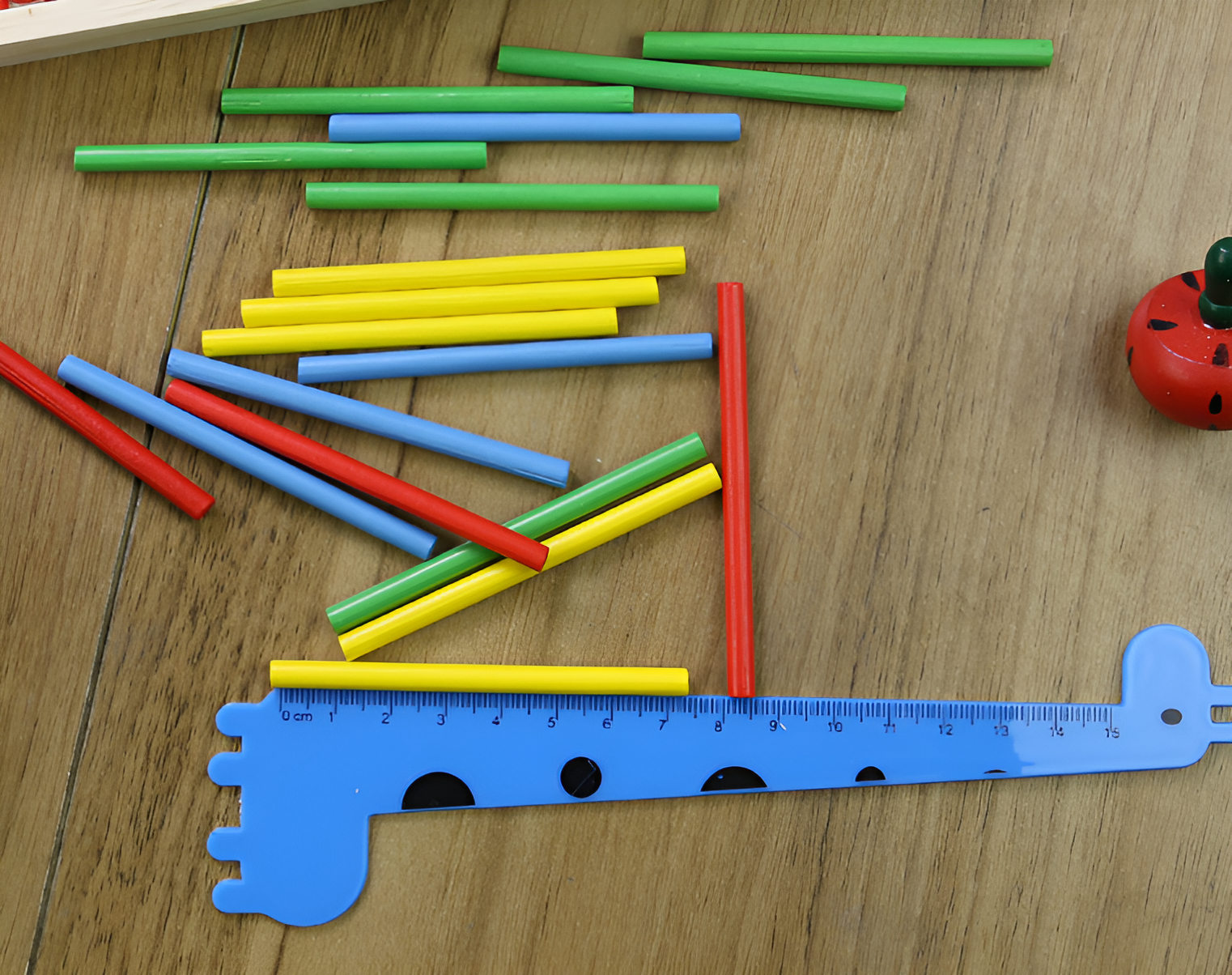 • Arithmetic Fun: Teach arithmetic with the Montessori Fun Math Toy by combining colored sticks. For example, combine six yellow sticks 💛 with three blue sticks 💙, and let your child count and say, "6 + 3 = 9."