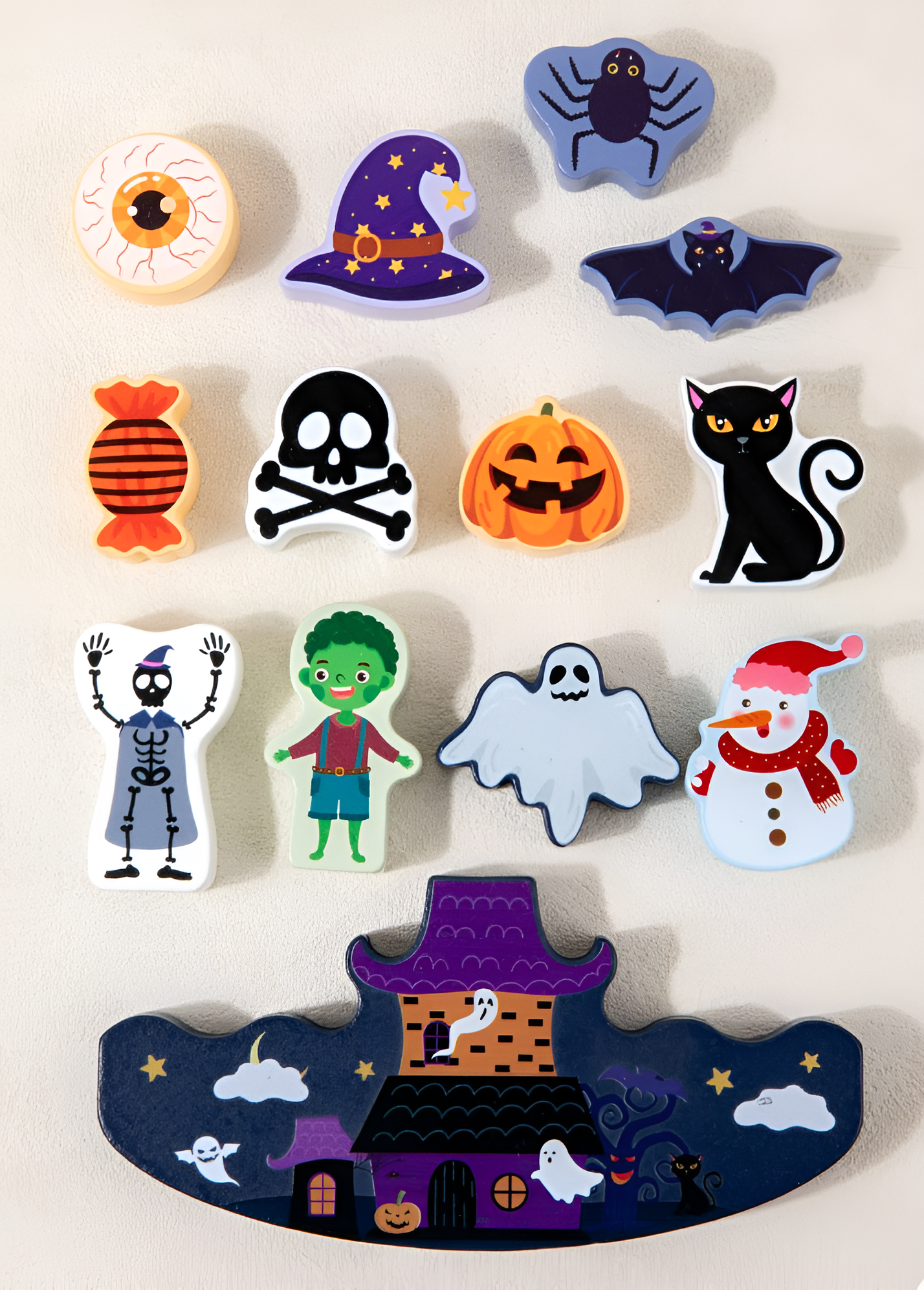 Embrace the spooky season with the Halloween edition of the Montessori Holiday Stacking Game! 👻 Featuring 13 frightfully fun pieces like a spider 🕷️, bat 🦇, witch hat 🎩, black cat 🐈‍⬛, jack o' lantern 🎃, skeleton ☠️, and a haunted house base 🏚️, this variant lets kids unleash their creativity while enjoying a ghoulishly good time! 🎨