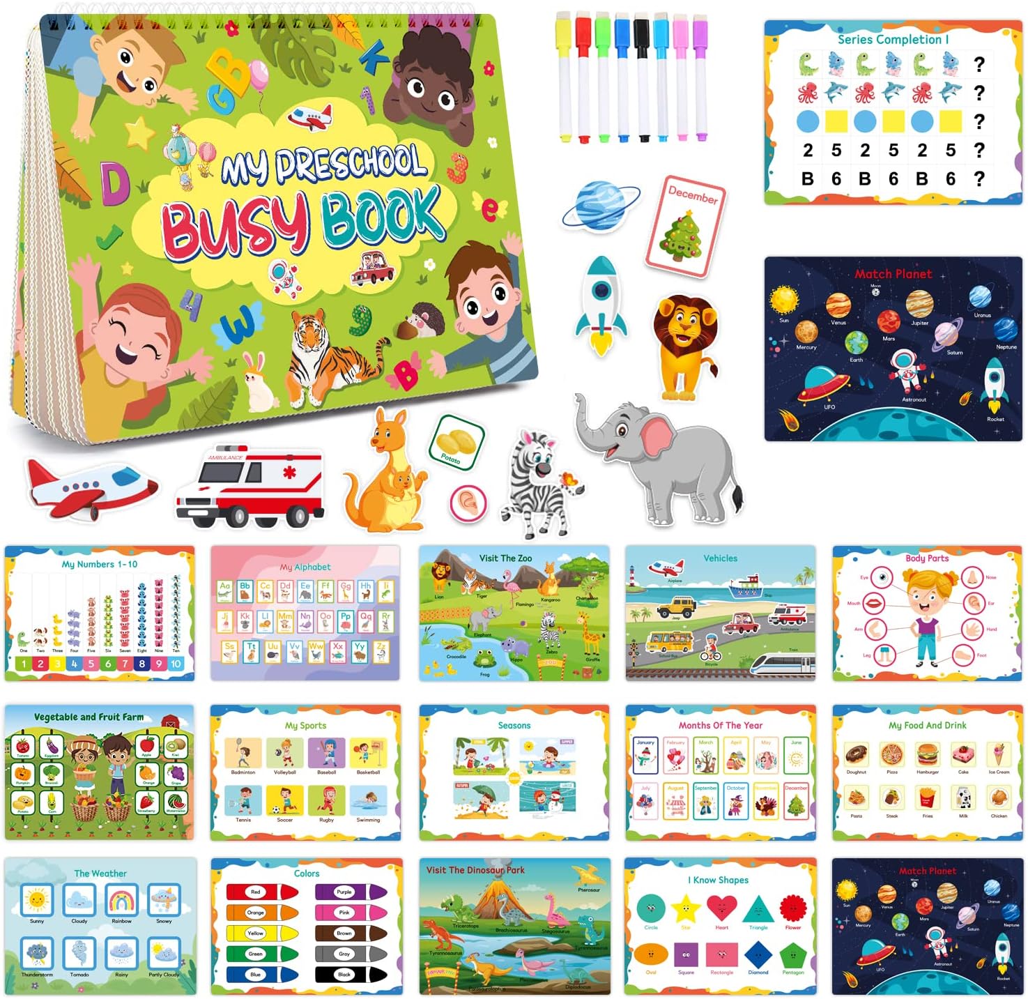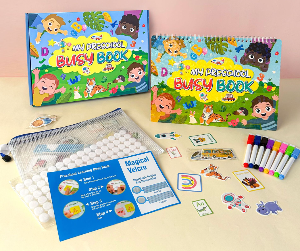✿ Drawing Book With 8 Color Markers: Dual functionality as a busy book and a drawing book! Kids can express their creativity on the back of each page. The package comes with eight vibrant color markers and wipes for endless fun.