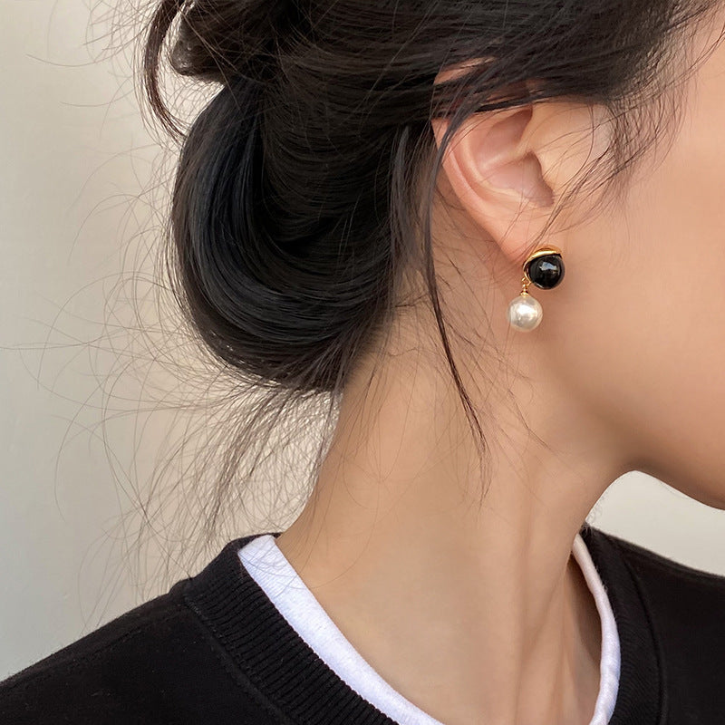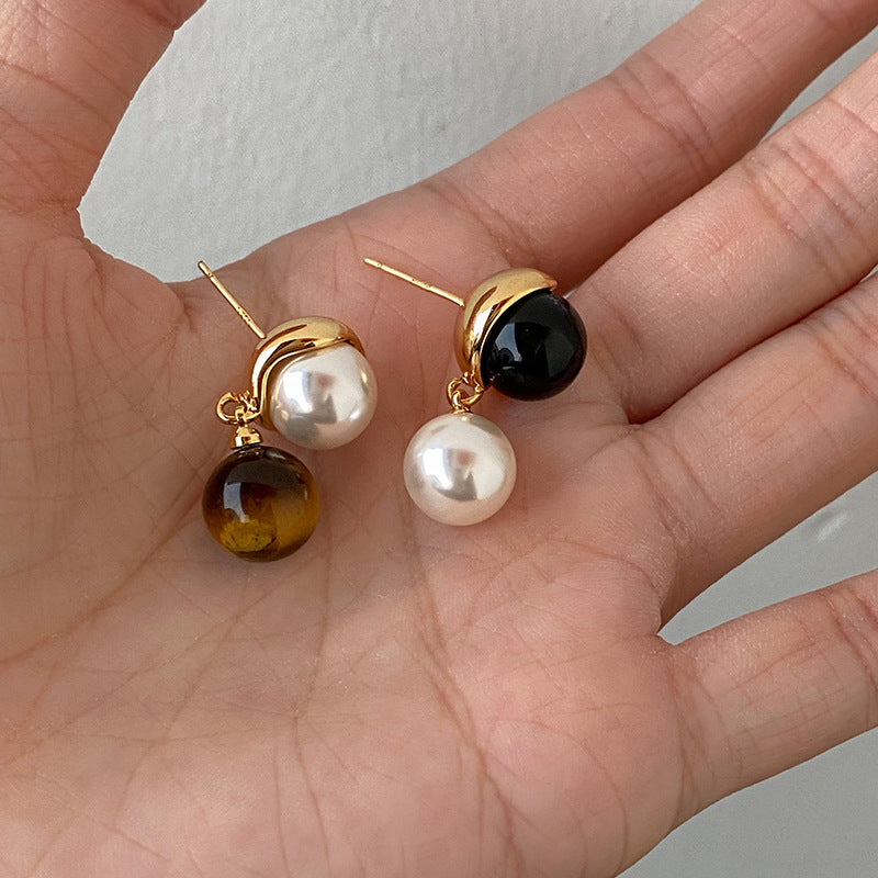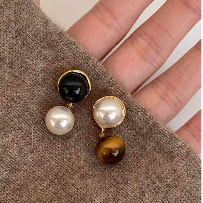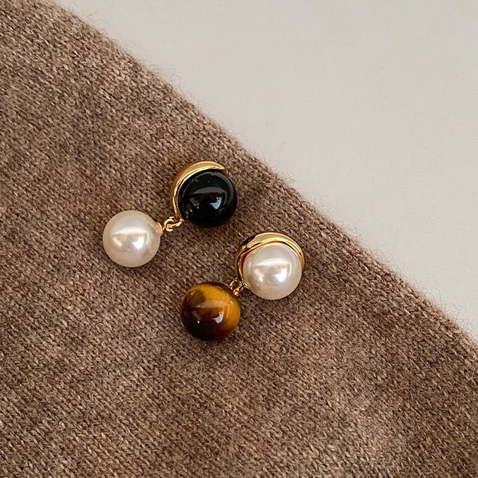 These Murad Asymmetrical Tiger's Eye Pearl Earrings are uniquely designed with a subtle blend of modernity and natural elements. Each earring features an asymmetrical design, with classic lustrous pearls paired with black round stones on one side, and a combination of tiger's eye stones and pearls on the other, creating a contrasting and layered look. The body of the earrings is made of gold-colored metal encasing the round pearls, adding a touch of luxury. The natural texture of the tiger's eye stones and the luster of the pearls reflect each other, presenting a sophisticated and personalized style for everyday wear or special occasions.
