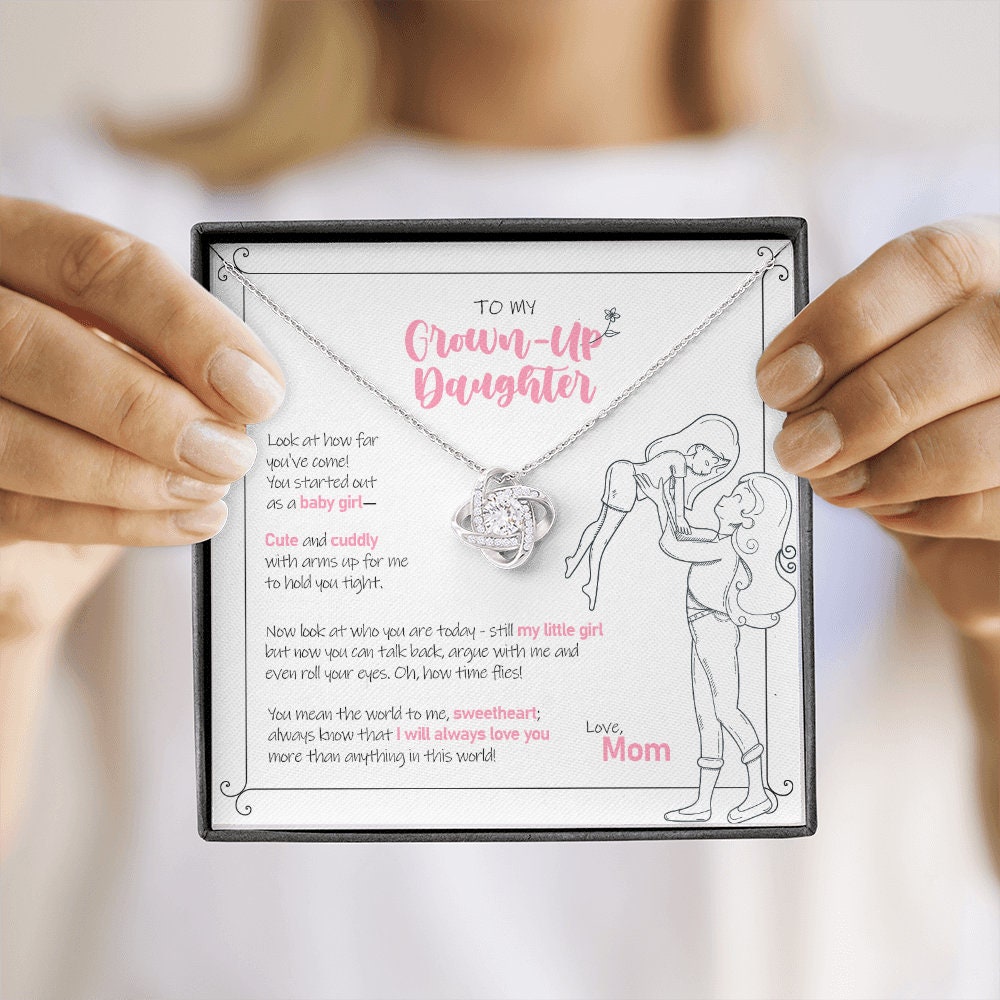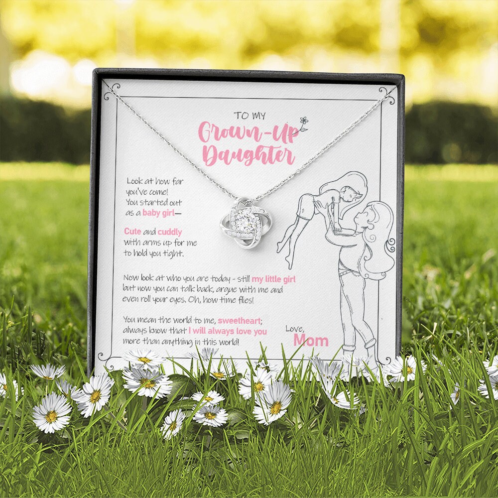 Show your daughter just how much you love her with this "Grown-Up Daughter" Love Knot Necklace.