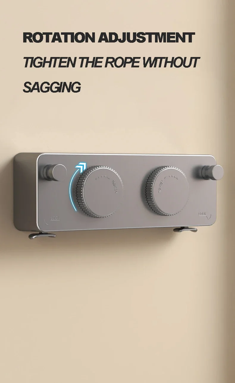Material: ABS case, aluminum bracket, 304 stainless steel | Extension Length: 5.1m total | Max Load: 44 lbs per line | Rope Type: Dual retractable lines | Mounting: Wall-mounted | Suitable For: Indoor & outdoor drying of clothes, towels, delicates, and more.