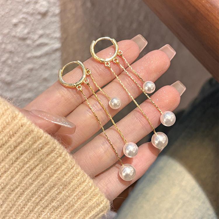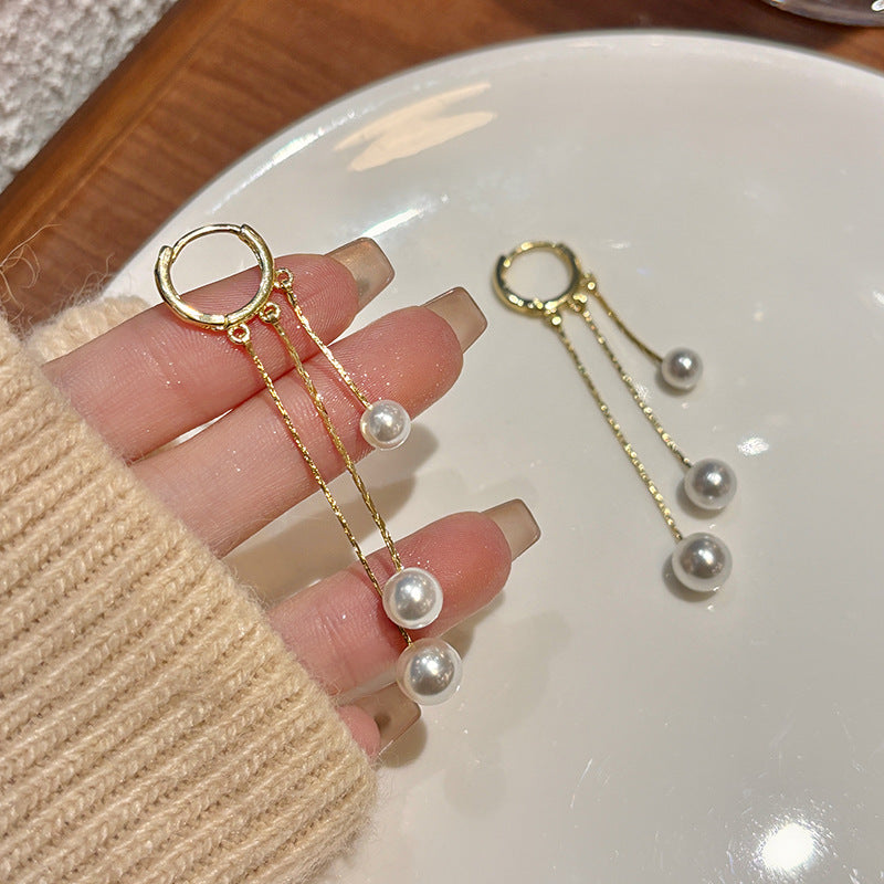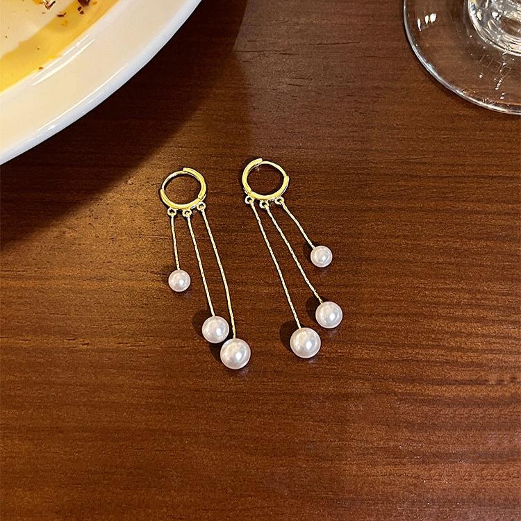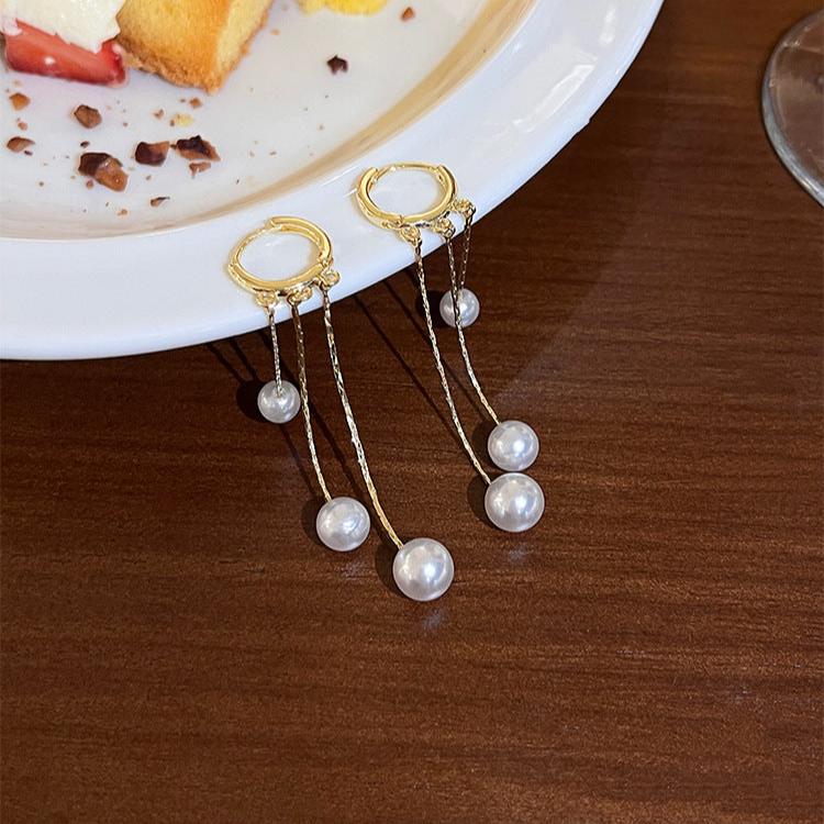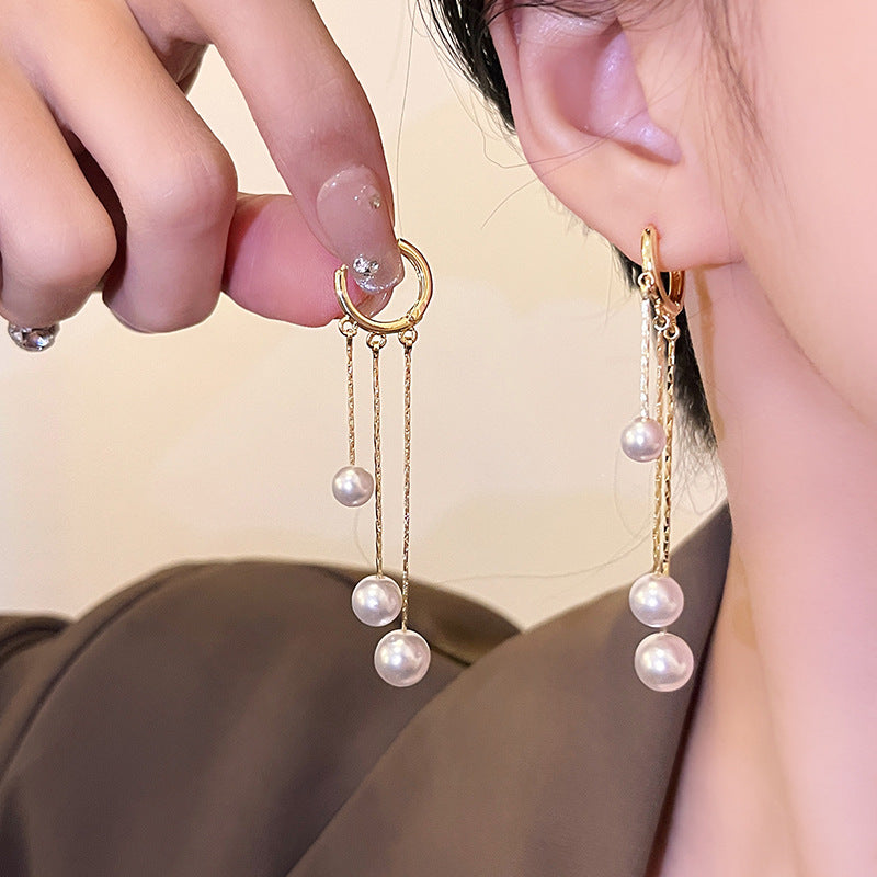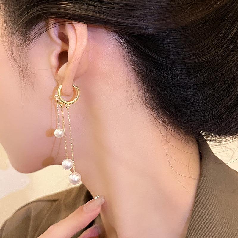 The pearl tassel earrings are a piece of jewelry that combines fashion with elegance. These earrings feature a simple and sophisticated design, with an overall structure that fits smoothly along the ear, showcasing a fluid and refined sense of line.
