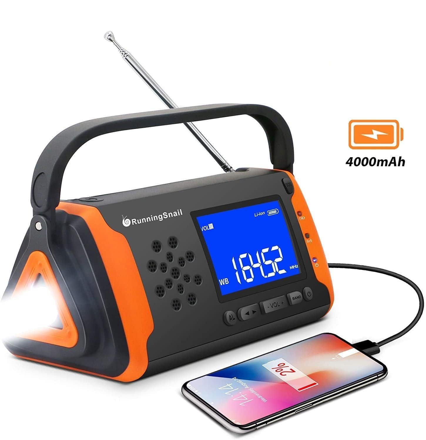 • A dead phone can be life-threatening Don't let your phone die when you need it most, such as power outage. Our weather radio with 4000 mAh can be powered by your phone more. Simply plug your phone or other USB devices into the USB port of this emergency radio for some extra juice.