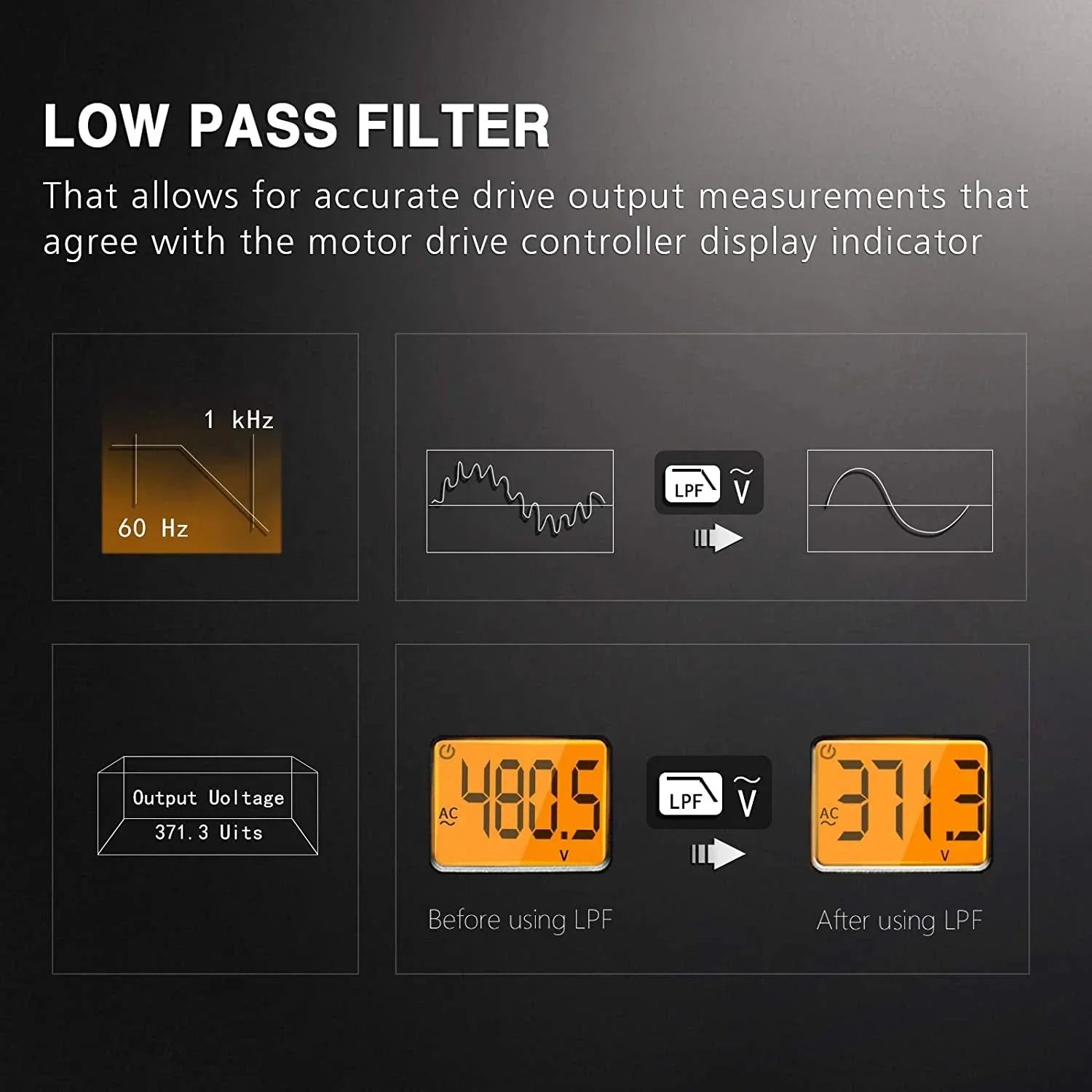 LowZ & LPF: Low input impedance helps prevent false readings due to ghost voltage. Low Pass Filter (LPF) for accurate measurement of variable frequency drive signals when measuring motors and transformer. To measure the current you need to clamp the meter around one of the wires and not the whole power cord.