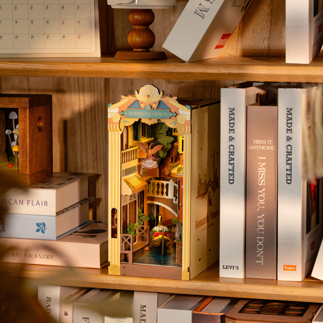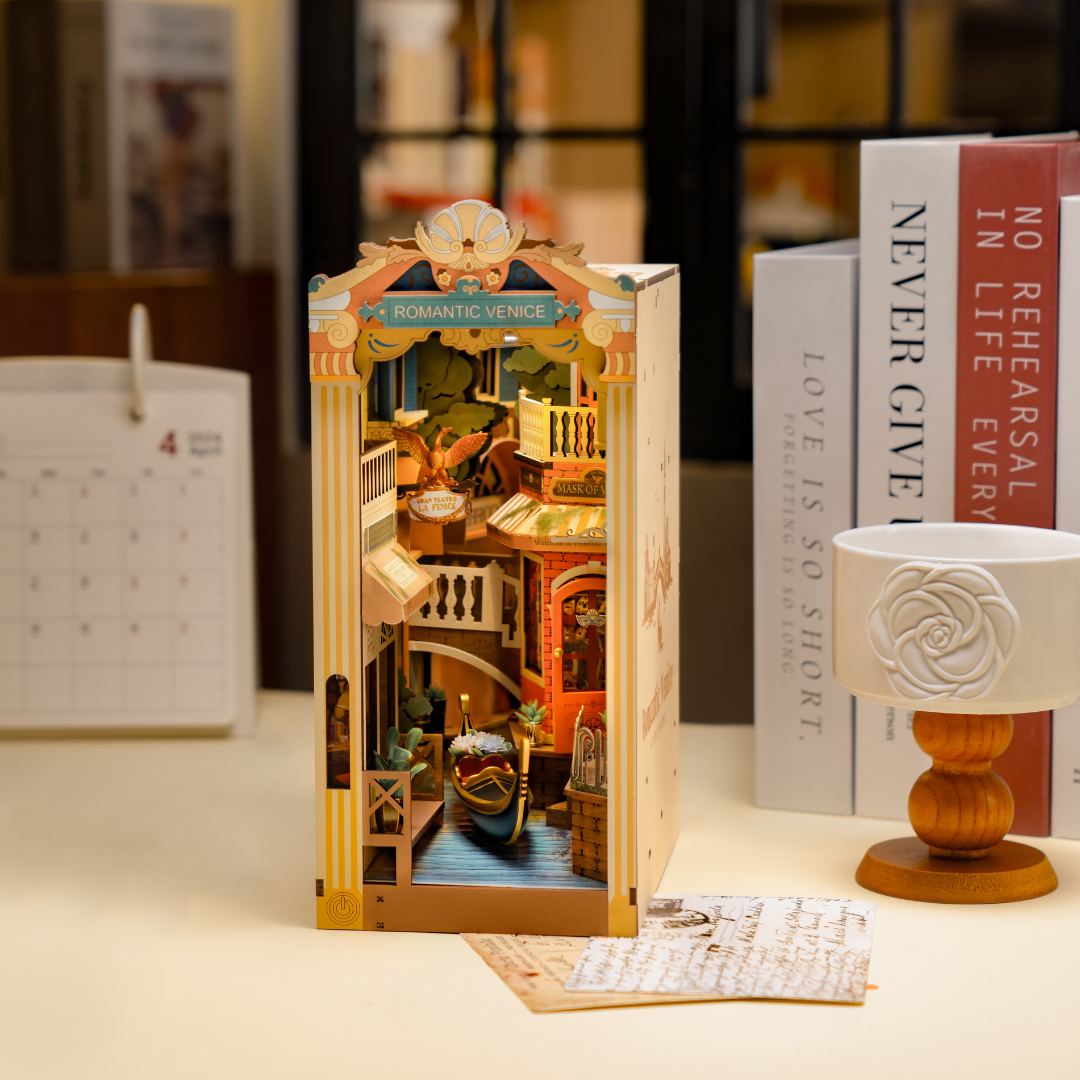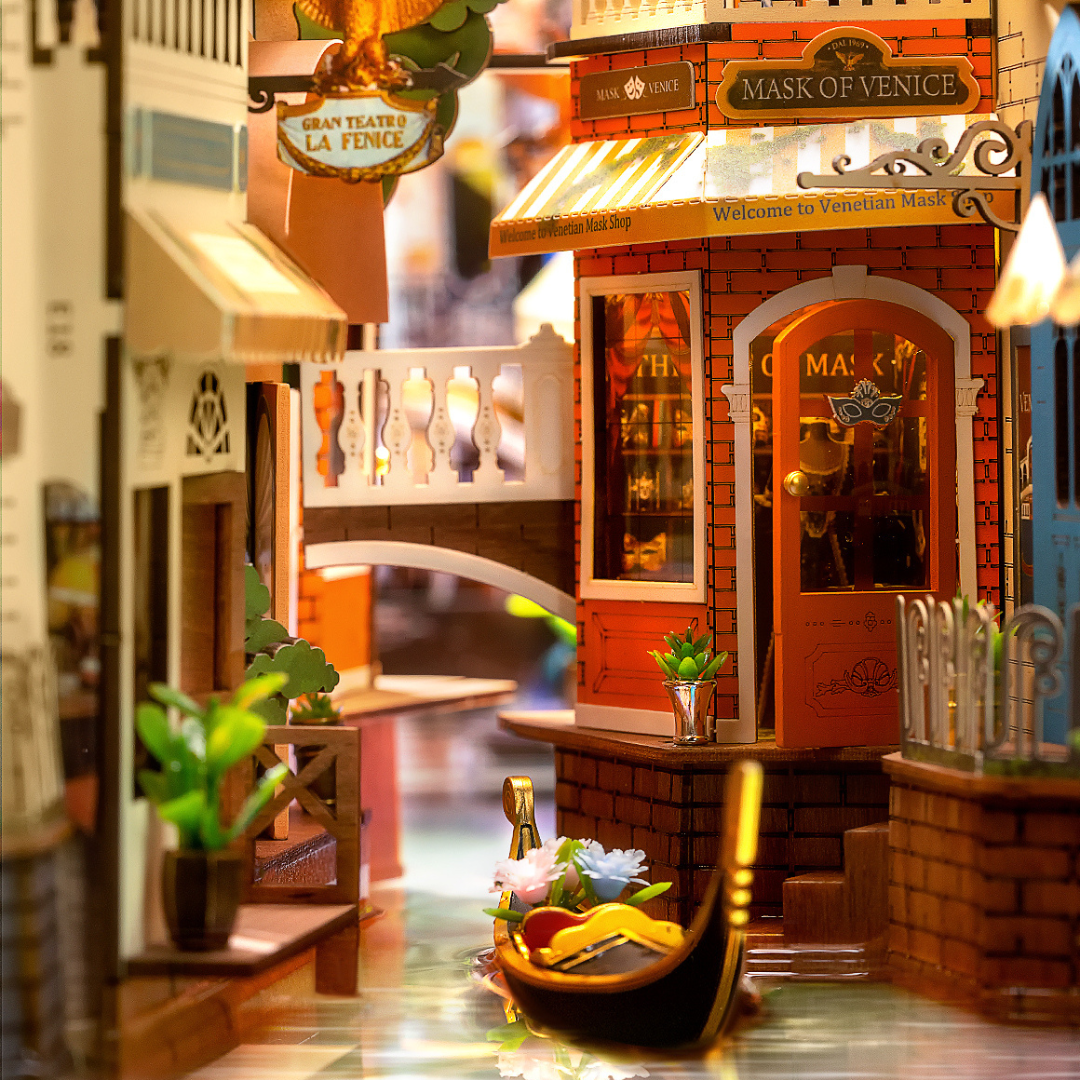Transport yourself to the timeless beauty of Venice with this intricately designed Romantic Venice Book Nook Kit. Inspired by the enchanting canals, arched bridges, and charming architecture, this DIY miniature kit captures the essence of Italy's most romantic city. Every detail, from the flowing waterways to the softly lit street-lamps, evokes the atmosphere of a peaceful Venetian evening.