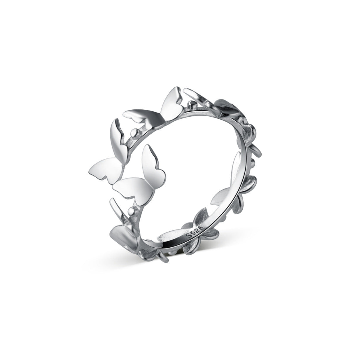 The design features a butterfly motif, with the butterfly's shape being lifelike and its wings flowing gracefully. The details of the butterfly are highlighted through fine engraving, adding depth and visual appeal to the ring.