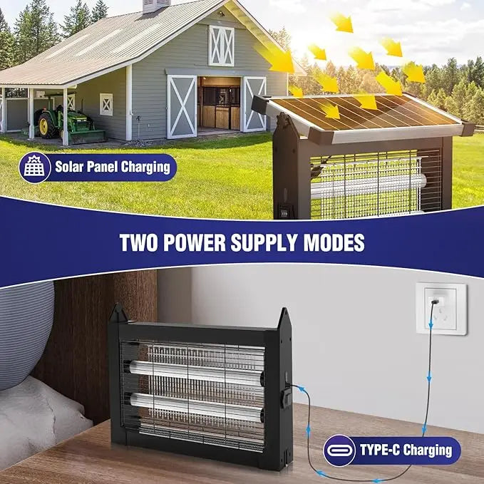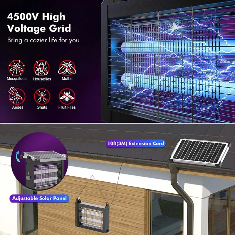 The built-in dusk-to-dawn sensor automatically charges during the day and activates mosquito-killing mode at night. Manual mode available for 24/7 use.