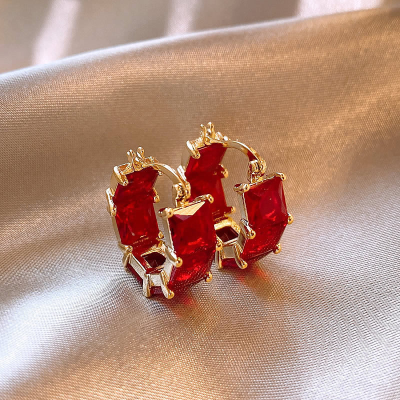 The earrings use a classic hoop clasp design for easy wear. The golden metal not only ensures durability but also complements the red/black gemstones, creating a luxurious color combination ideal for formal occasions. These earrings exude a noble and elegant style, perfect for those who enjoy eye-catching accessories.