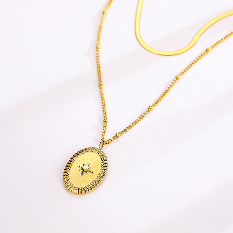 This double-layer necklace with an eight-pointed star engraved in the middle of the oval plate combines the symbolic meaning of the eight-pointed star and the oval plate, making it a highly meaningful personalized jewelry piece.