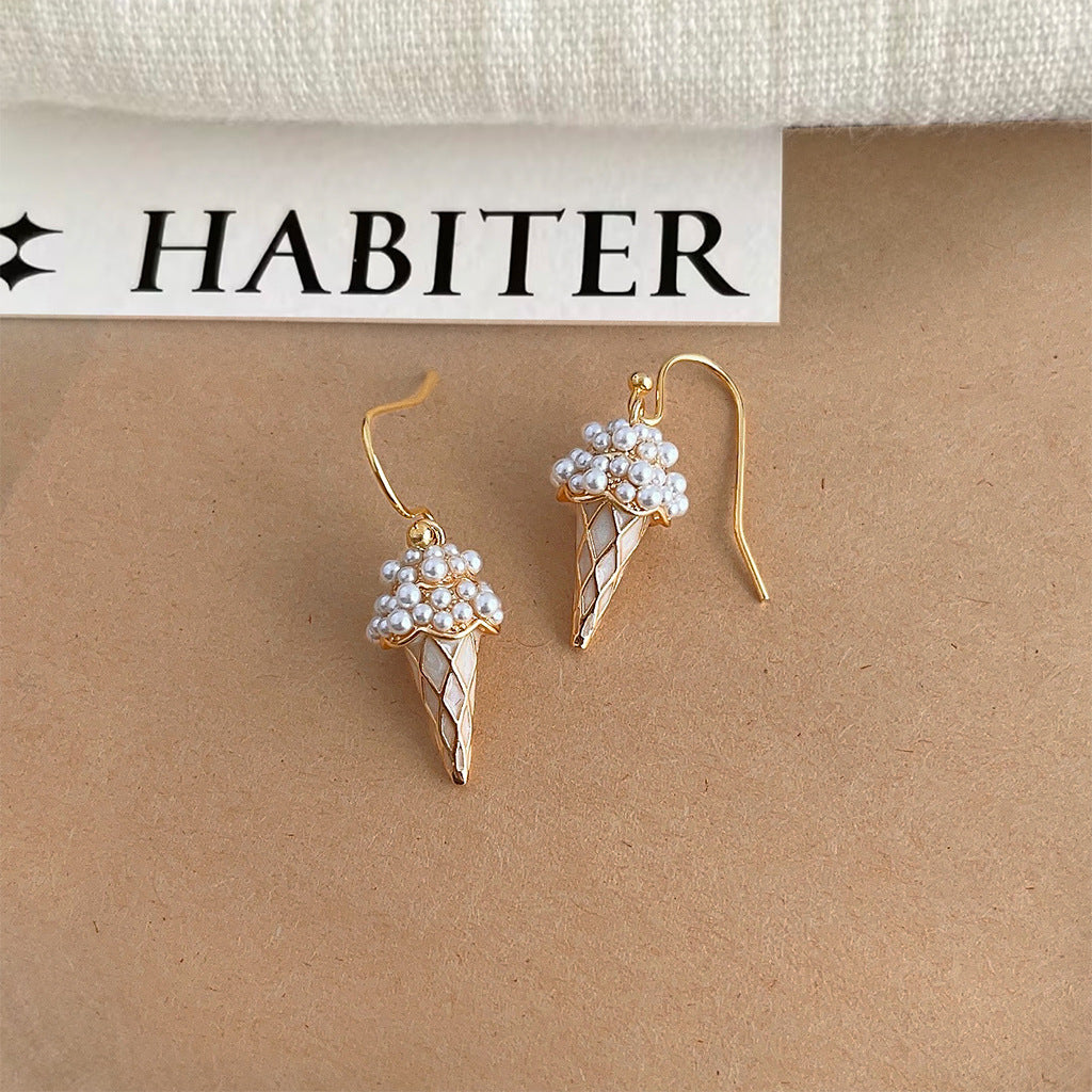 The main body of the earrings is designed in the shape of a cute cone with great attention to detail. The conical portion of the cone exhibits a realistic texture. The ice cream part of the cone is embellished with a few small pearls, whose rounded luster echoes the delicate texture of the cone. The pearl embellishment not only enriches the visual level of the earrings, but also adds to the overall sense of sophistication, making the earrings shine charmingly in the sunlight.