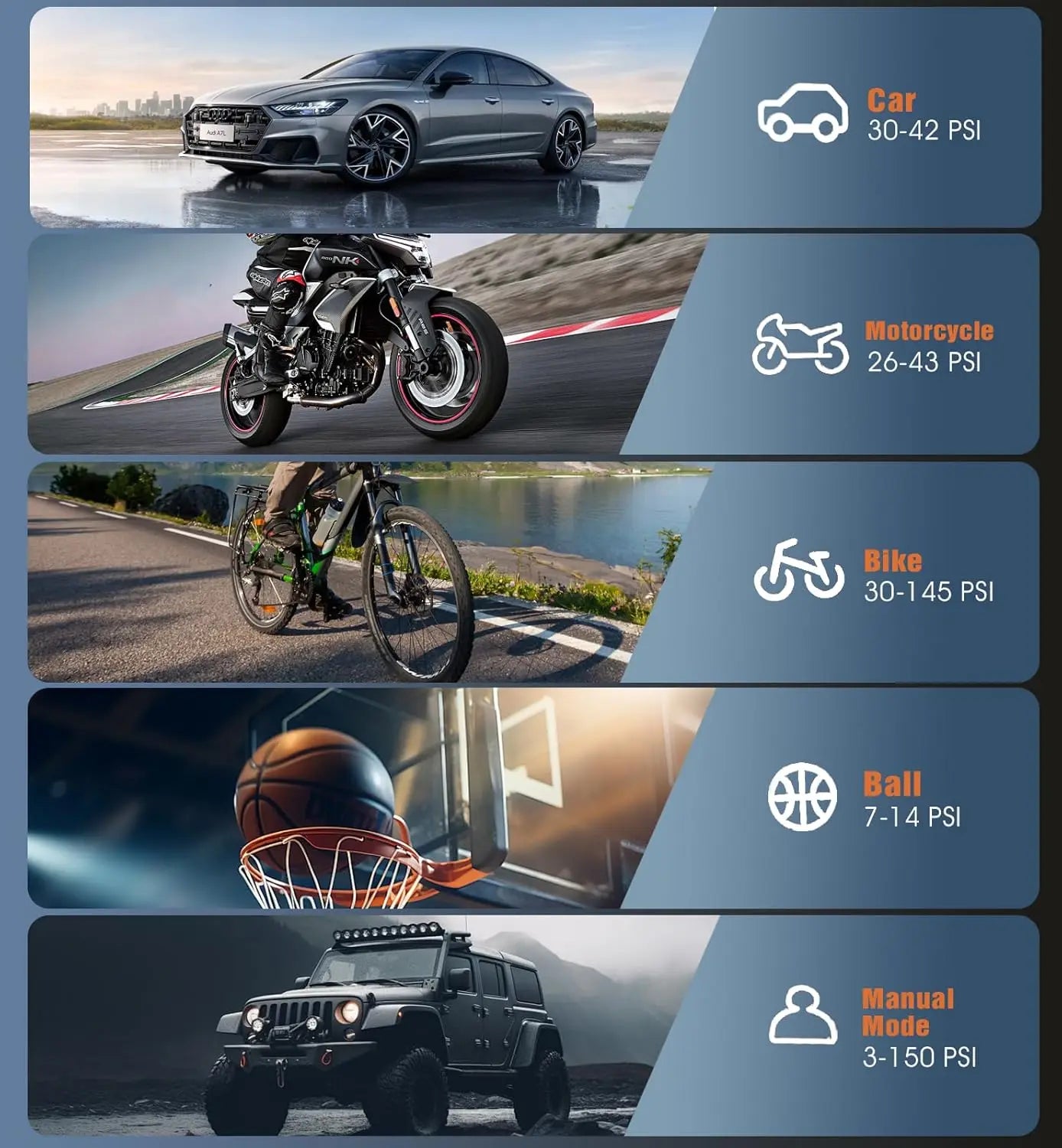 • 🔄 4+N Smart Inflation Modes – Preset modes for cars, motorcycles, bikes, and balls, plus a custom mode with 4 pressure units (PSI, KPA, BAR, KG/CM²).