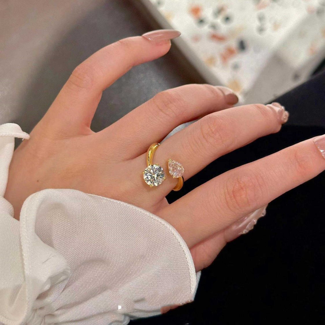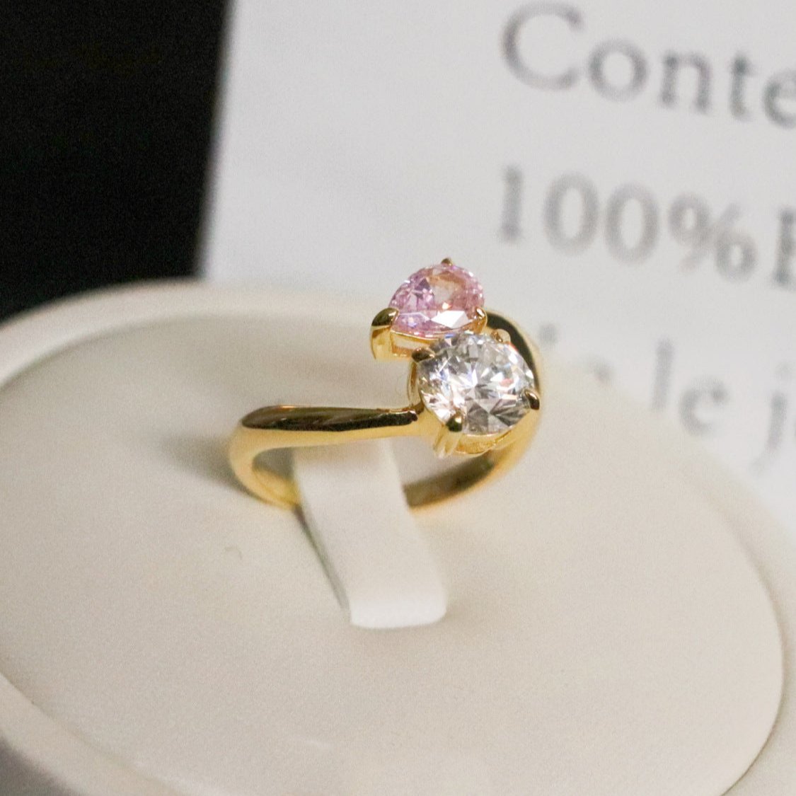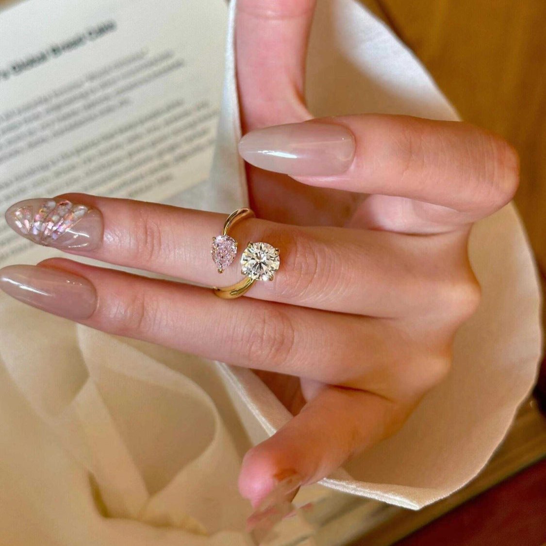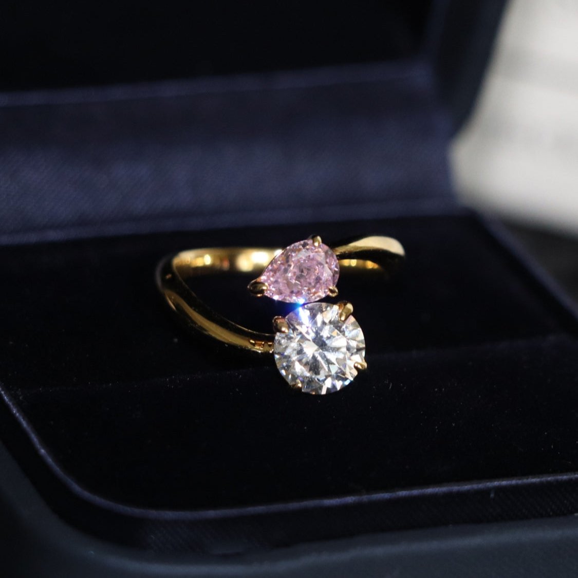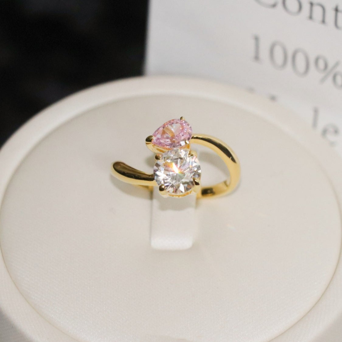 Next to the white round zircon, a pink teardrop-shaped zircon is set. The pink teardrop zircon presents a soft and enchanting hue, creating a striking contrast with the white round zircon while also complementing each other. The teardrop shape adds elegance and uniqueness to the pink zircon, enhancing the ring's delicate beauty.
