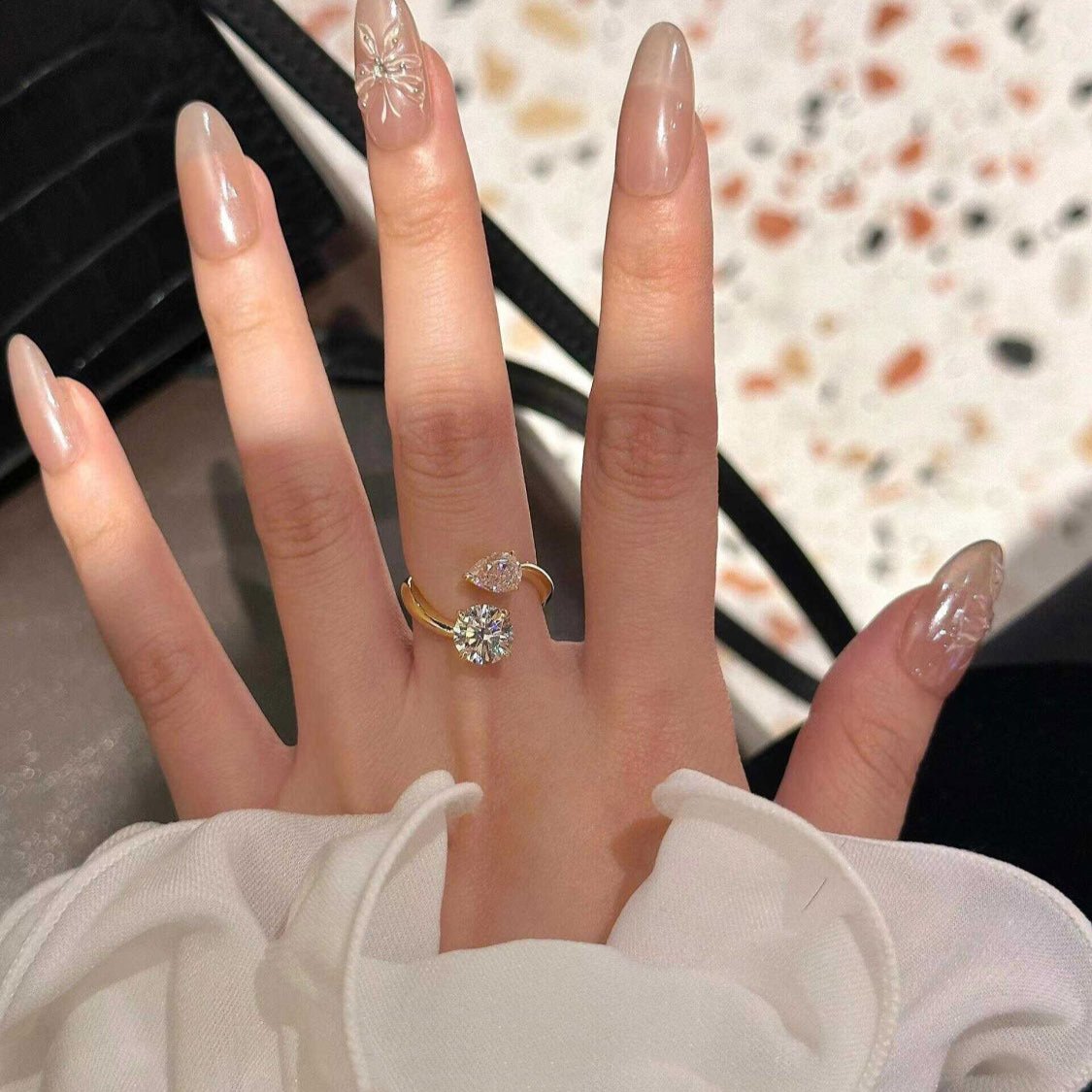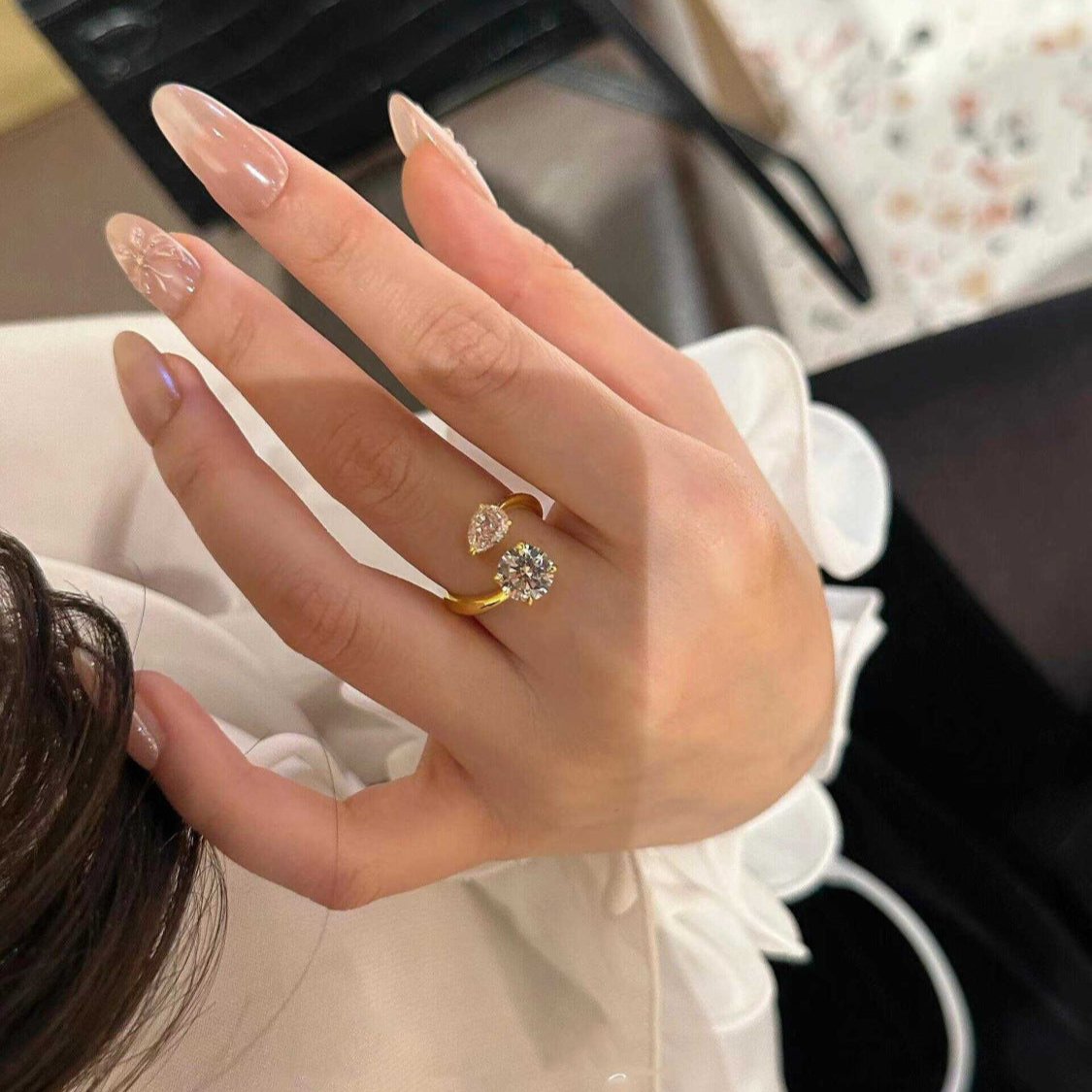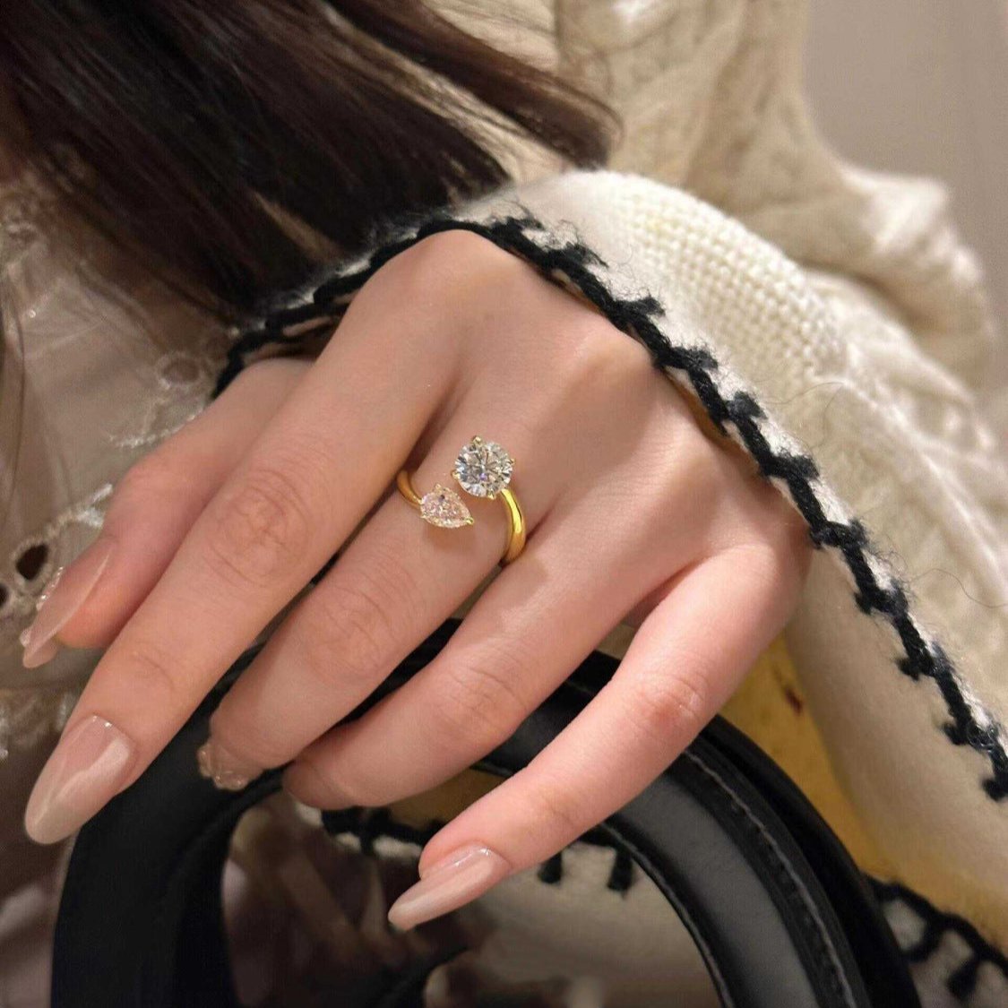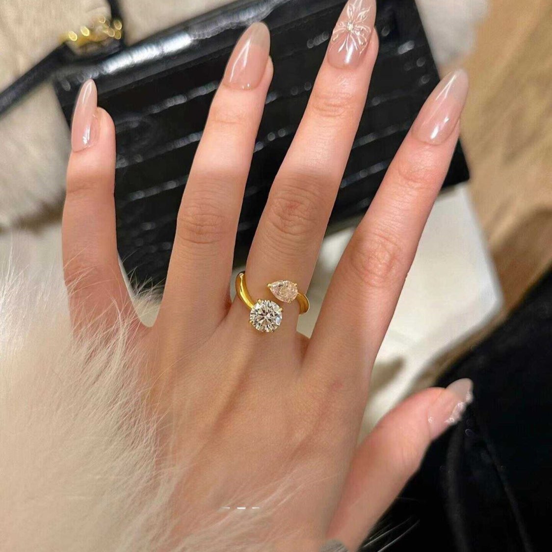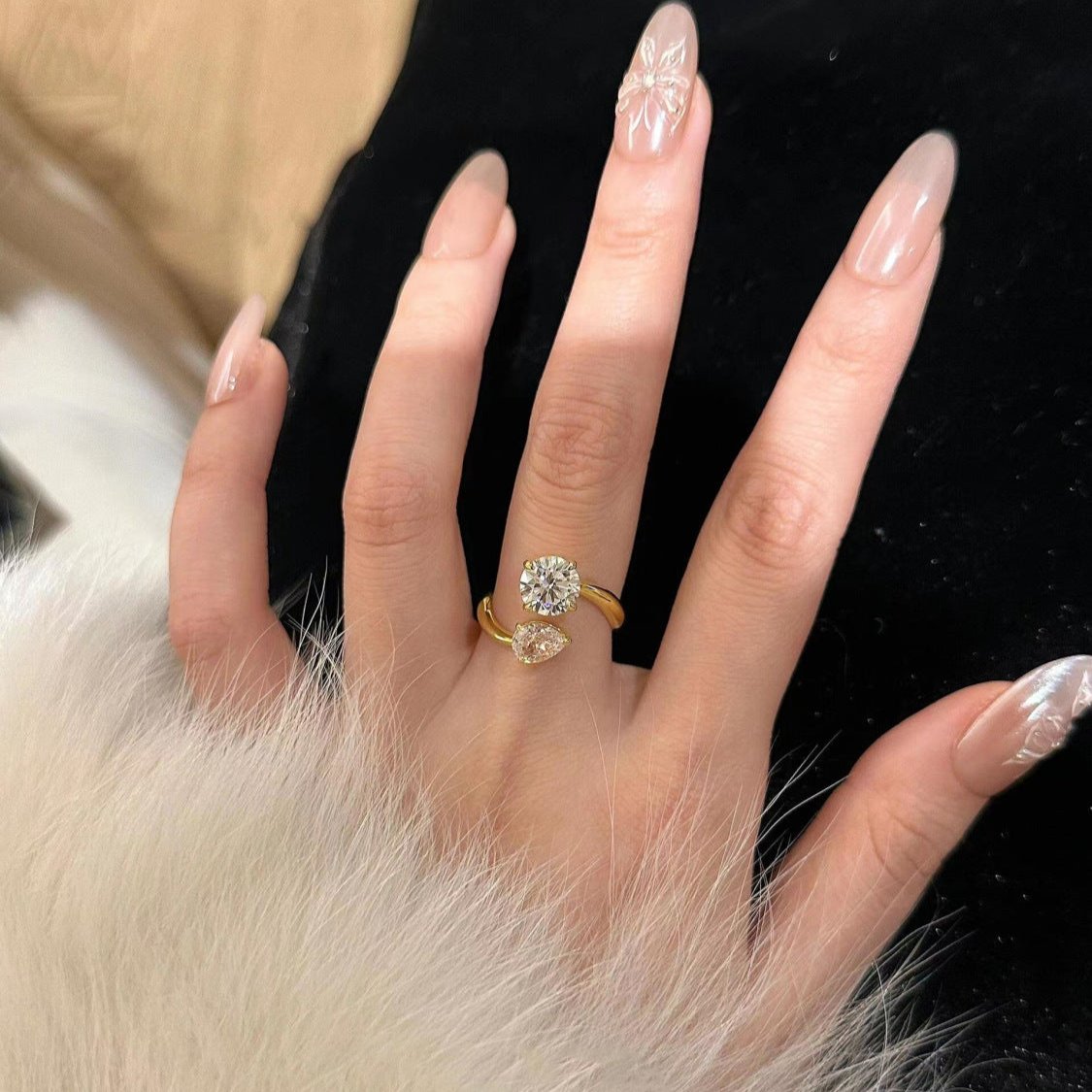 Next to the white round zircon, a pink teardrop-shaped zircon is set. The pink teardrop zircon presents a soft and enchanting hue, creating a striking contrast with the white round zircon while also complementing each other. The teardrop shape adds elegance and uniqueness to the pink zircon, enhancing the ring's delicate beauty.