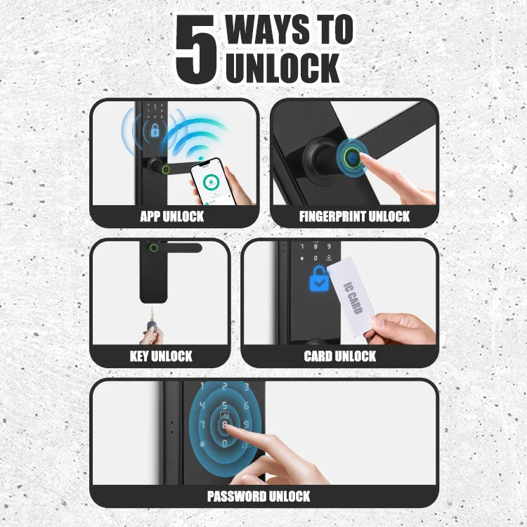 Unlock Methods: Fingerprint, Password, RFID Card, TTLock App, Mechanical Key
